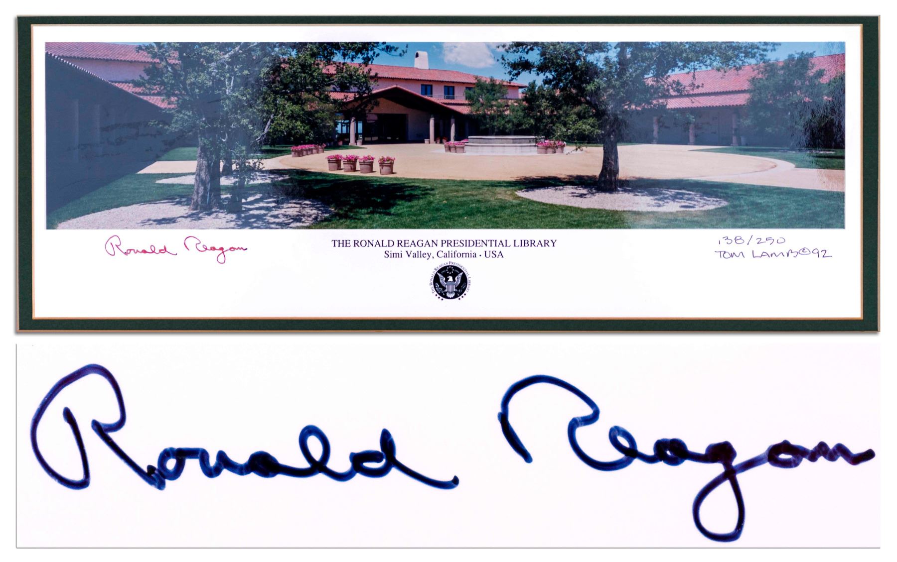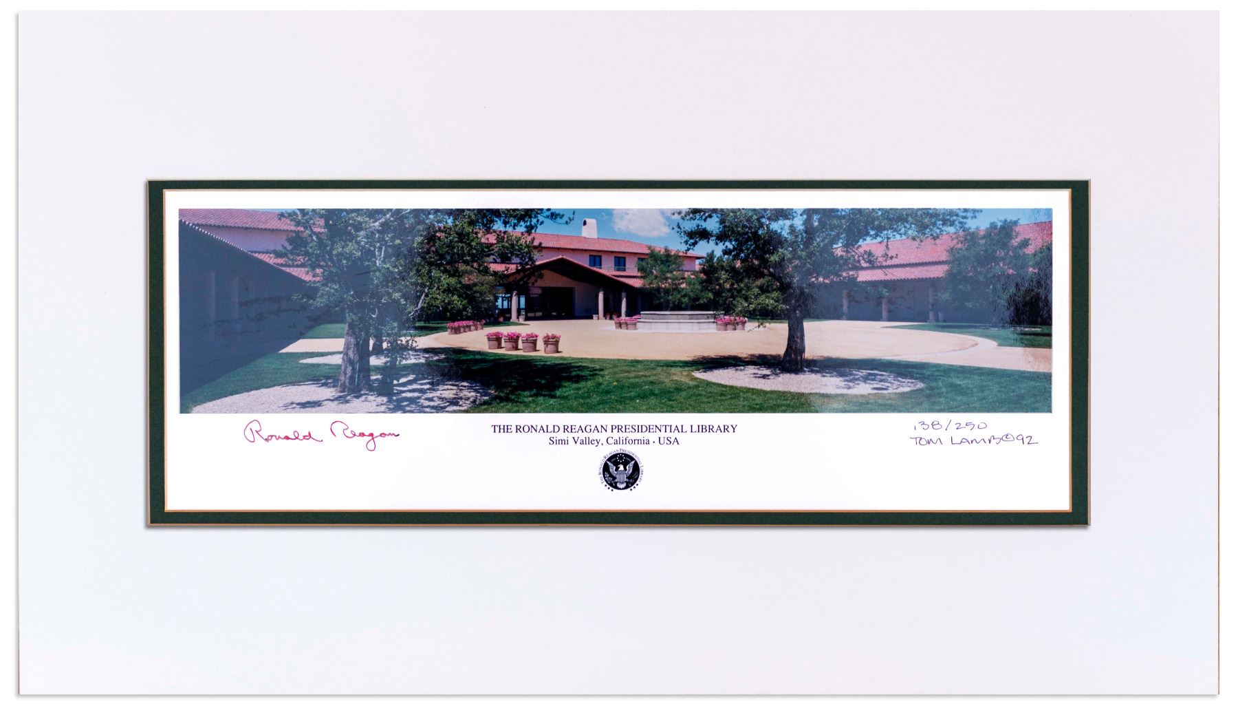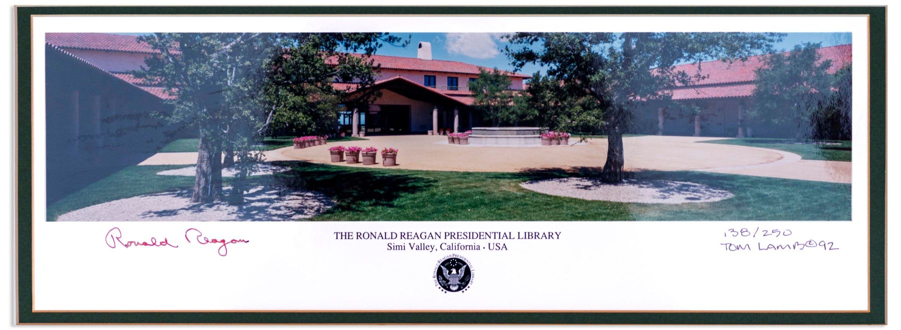 Beautifully preserved Ronald Reagan signed panoramic photo of his Presidential Library, #138 in a limited edition of 250 also signed by the photographer Thomas Lamb. Large glossy photo measures 17'' x 8'', boldly signed ''Ronald Reagan'' in black felt-tip. This was Reagan's favorite photograph of his Presidential Library. Double matted to a size of 20'' x 11.5''. Near fine condition with no flaws.