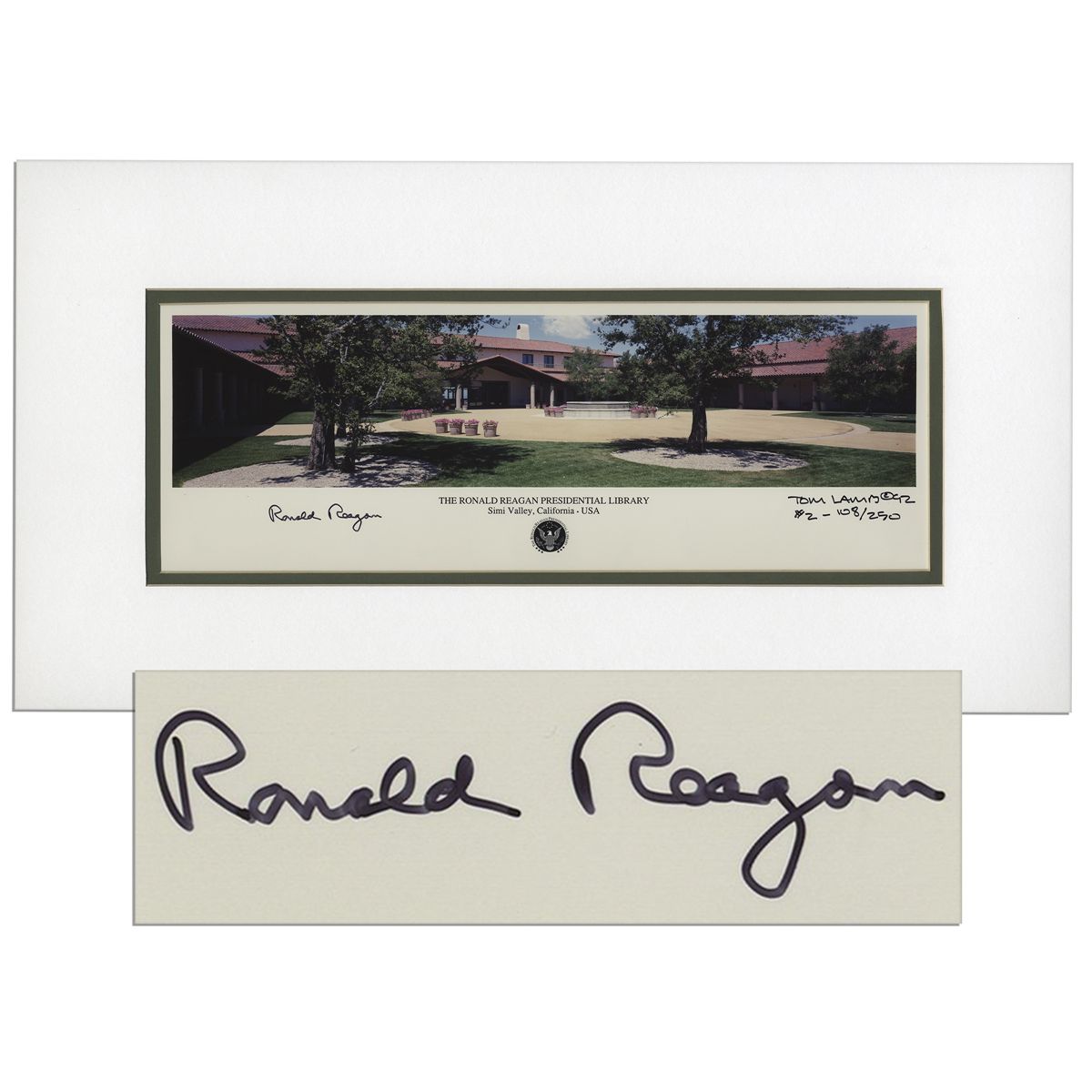 Limited edition photo of the Reagan Presidential Library and Museum, signed ''Ronald Reagan'' in black felt tip on its border at left of center. Photo is numbered 108 of 250 and is also signed by photographer Tom Lamb. Image of the library and grounds is captioned with its name and location in Simi Valley, California. Double-matted to an overall size of 20'' x 10.75''. Fine. Originally sold at the library itself and accompanied by its COA.