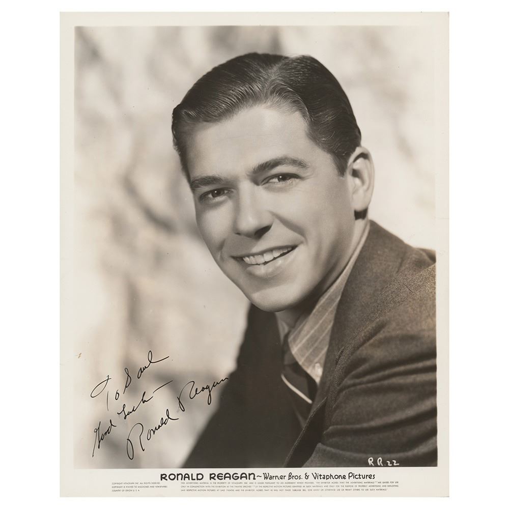 Vintage glossy 8 x 10 Warner Bros. and Vitaphone publicity photo, signed and inscribed in-person in fountain pen, "To Saul, Good luck - Ronald Reagan." Reverse of photo bears a collector's stamp date of December 16, 1939, the date the signature was acquired. In very good to fine condition, with some surface impressions to Reagan's face from notations on reverse, and a light paperclip impression to the right edge. Reagan is quite uncommon in authentic signed photos from this era, as his mother signed most photos for him.