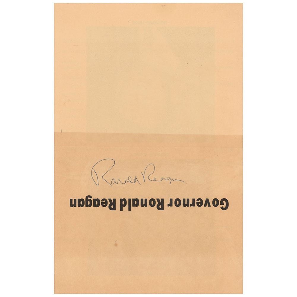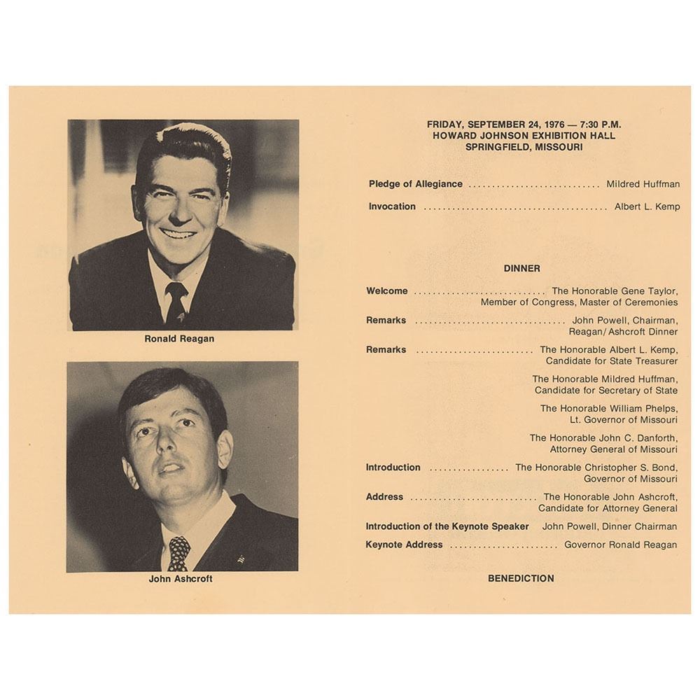 Program for a speech by "Governor Ronald Reagan," held at the Howard Johnson Exhibition Hall in Springfield, Missouri, on September 24, 1976, signed upside down on the front cover in ballpoint by Reagan. In very good to fine condition, with toning from prior display, and old adhesive residue on the back cover.