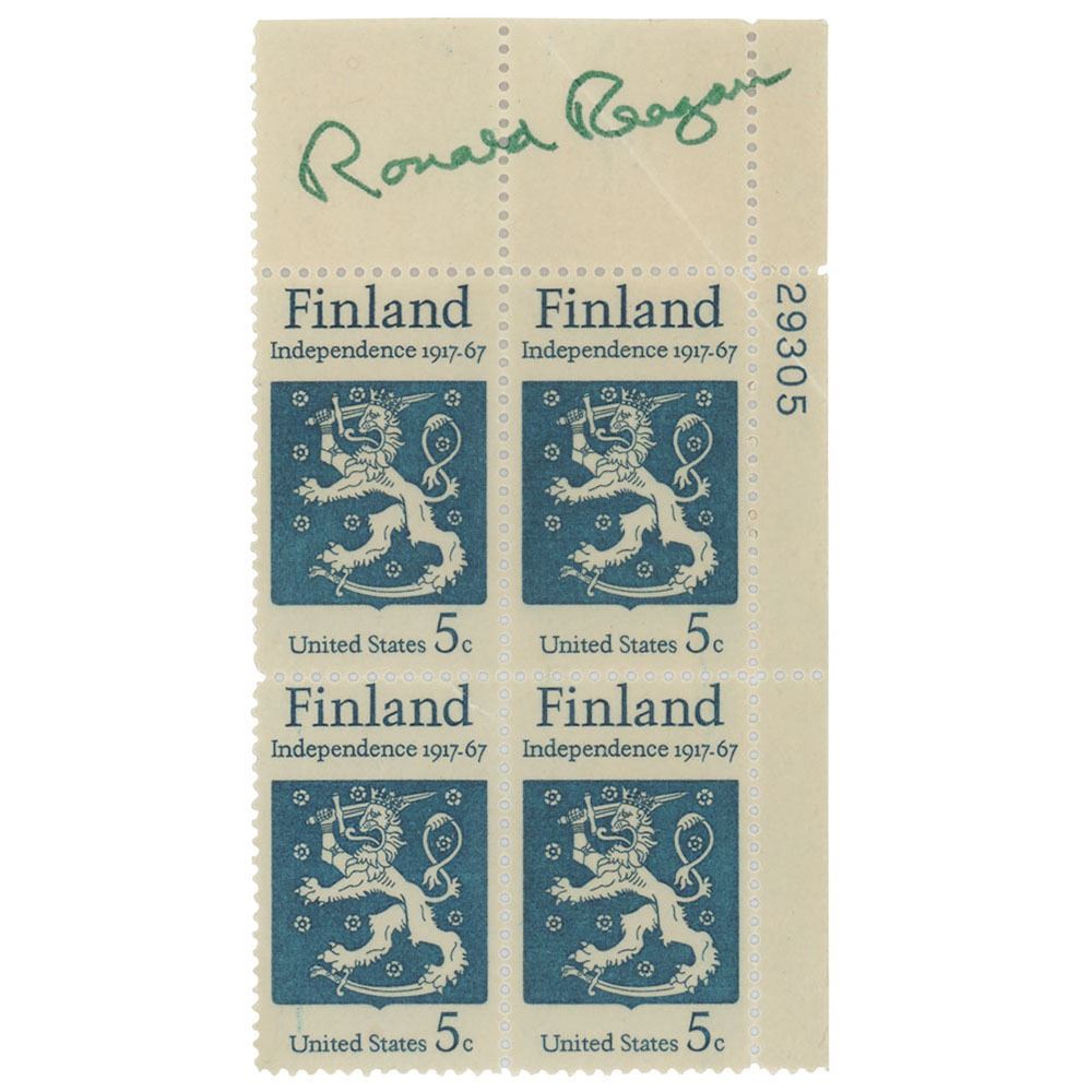 Block of four 5-cent stamps honoring the 50th anniversary of Finland's independence, 2.25 x 4.25, signed in the upper border in felt tip by Ronald Reagan. In fine condition. Accompanied by a full letter of authenticity from JSA.