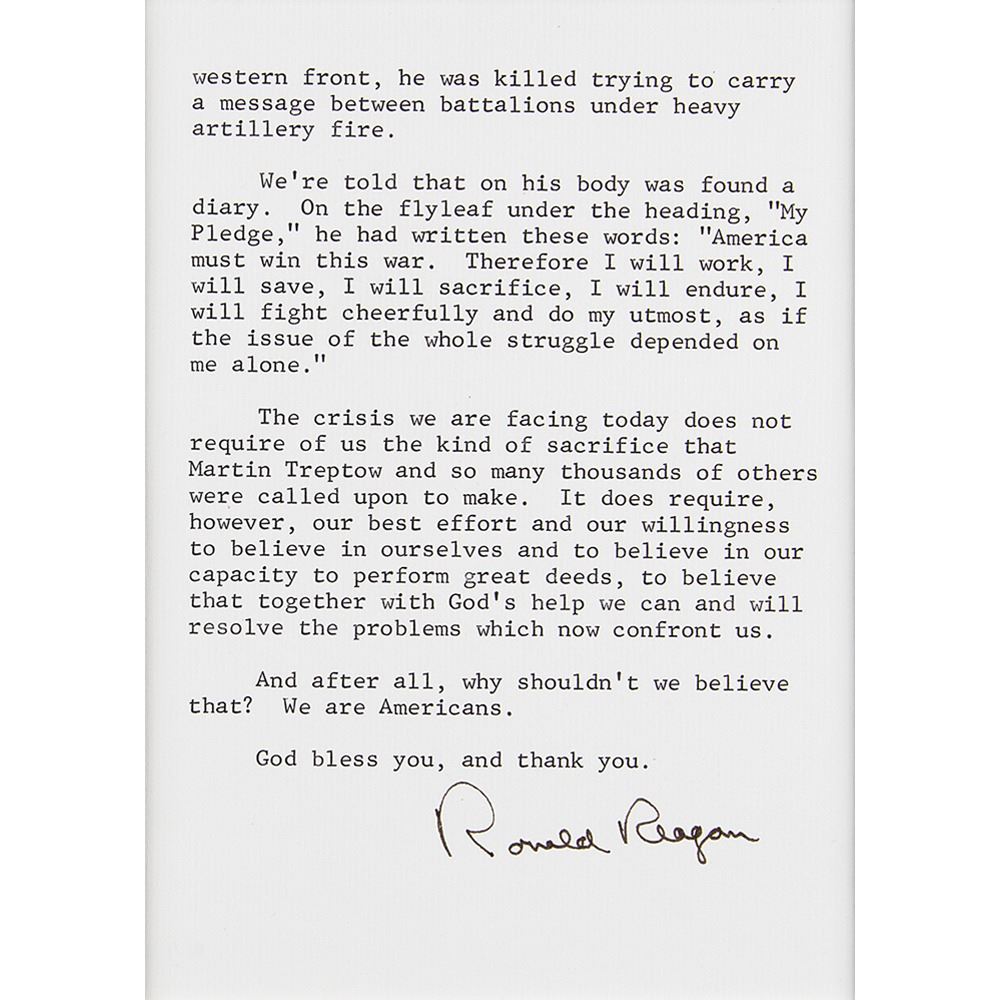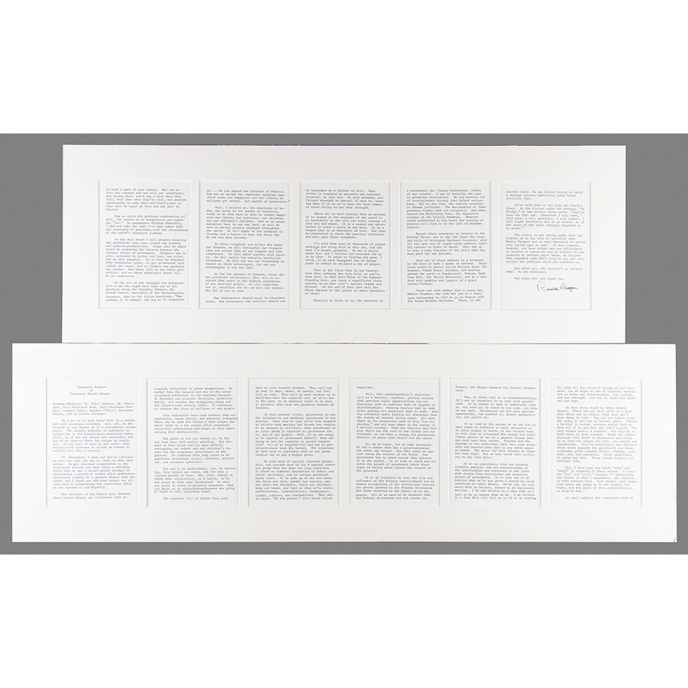 Desirable 11-page typescript of Ronald Reagan’s inaugural address, which he delivered on Tuesday, January 20, 1981, at the West Front of the United States Capitol in Washington, D.C., the first inauguration to be held on the building's west side. The pages are presented in two matted displays that measure 38 x 11.25 and 32.25 x 11.25, with Reagan signing neatly at the bottom of the final page in black ink. The speech, in part: “The economic ills we suffer have come upon us over several decades. They will not go away in days, weeks, or months, but they will go away. They will go away because we as Americans have the capacity now, as we've had in the past, to do whatever needs to be done to preserve this last and greatest bastion of freedom. In this present crisis, government is not the solution to our problem; government is the problem...In the days ahead I will propose removing the roadblocks that have slowed our economy and reduced productivity. Steps will be taken aimed at restoring the balance between the various levels of government. Progress may be slow, measured in inches and feet, not miles, but we will progress. It is time to reawaken this industrial giant, to get government back within its means, and to lighten our punitive tax burden. And these will be our first priorities, and on these principles there will be no compromise.†In fine condition.