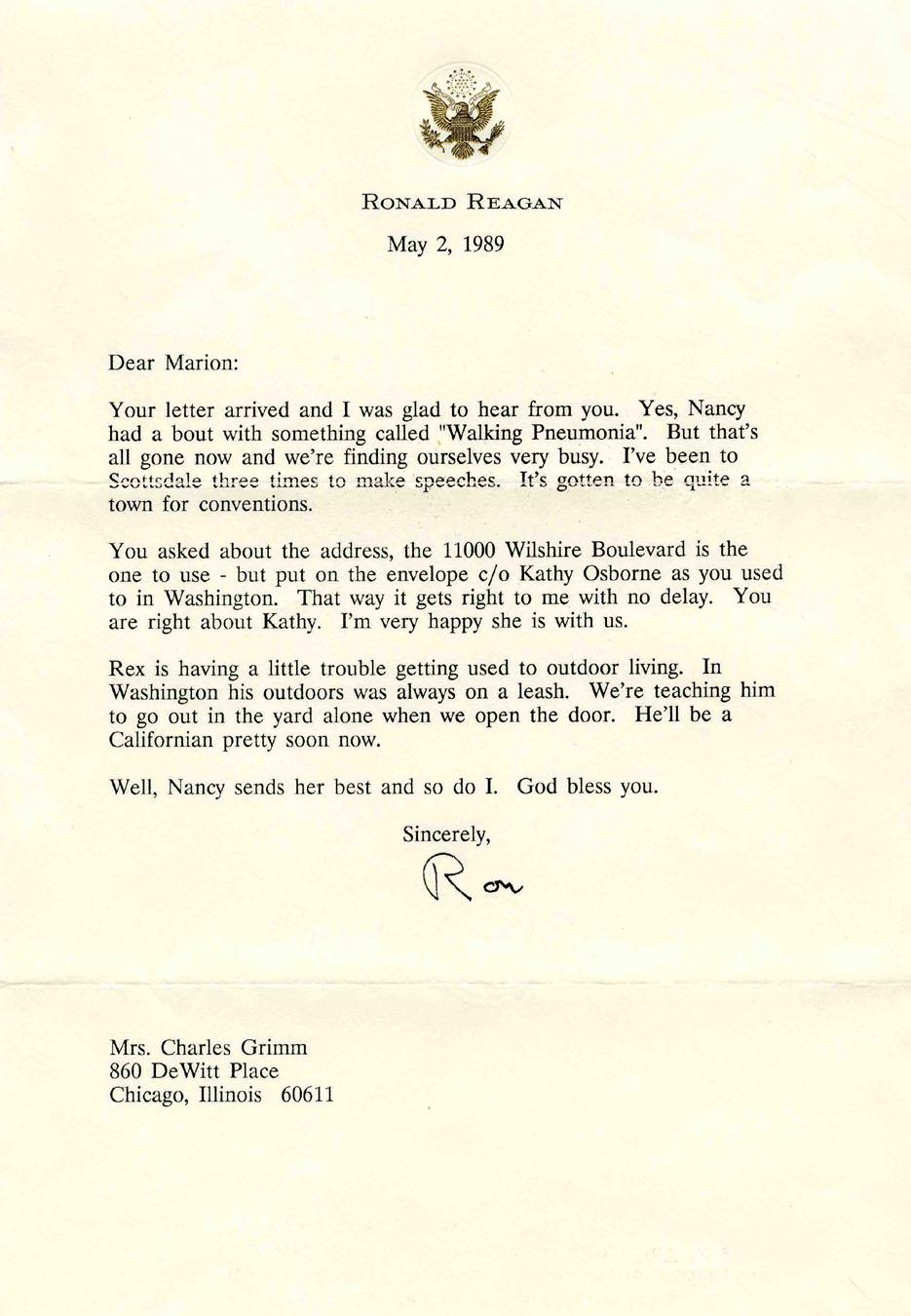 Typed letter signed by Ronald Reagan. Composed on Presidential Seal stationery and dated 2 May 1989, Reagan writes to Marion Grimm, the widow of Chicago Cubs manager, Charlie Grimm. In part: ''...Nancy had a bout with...'Walking Pneumonia'. But that's all gone now and we're finding ourselves very busy. I've been to Scottsdale three times to make speeches...Rex is having a little trouble getting used to outdoor living...He'll be a Californian pretty soon now...Sincerely, Ron.'' Some light wrinkling, otherwise excellent condition.