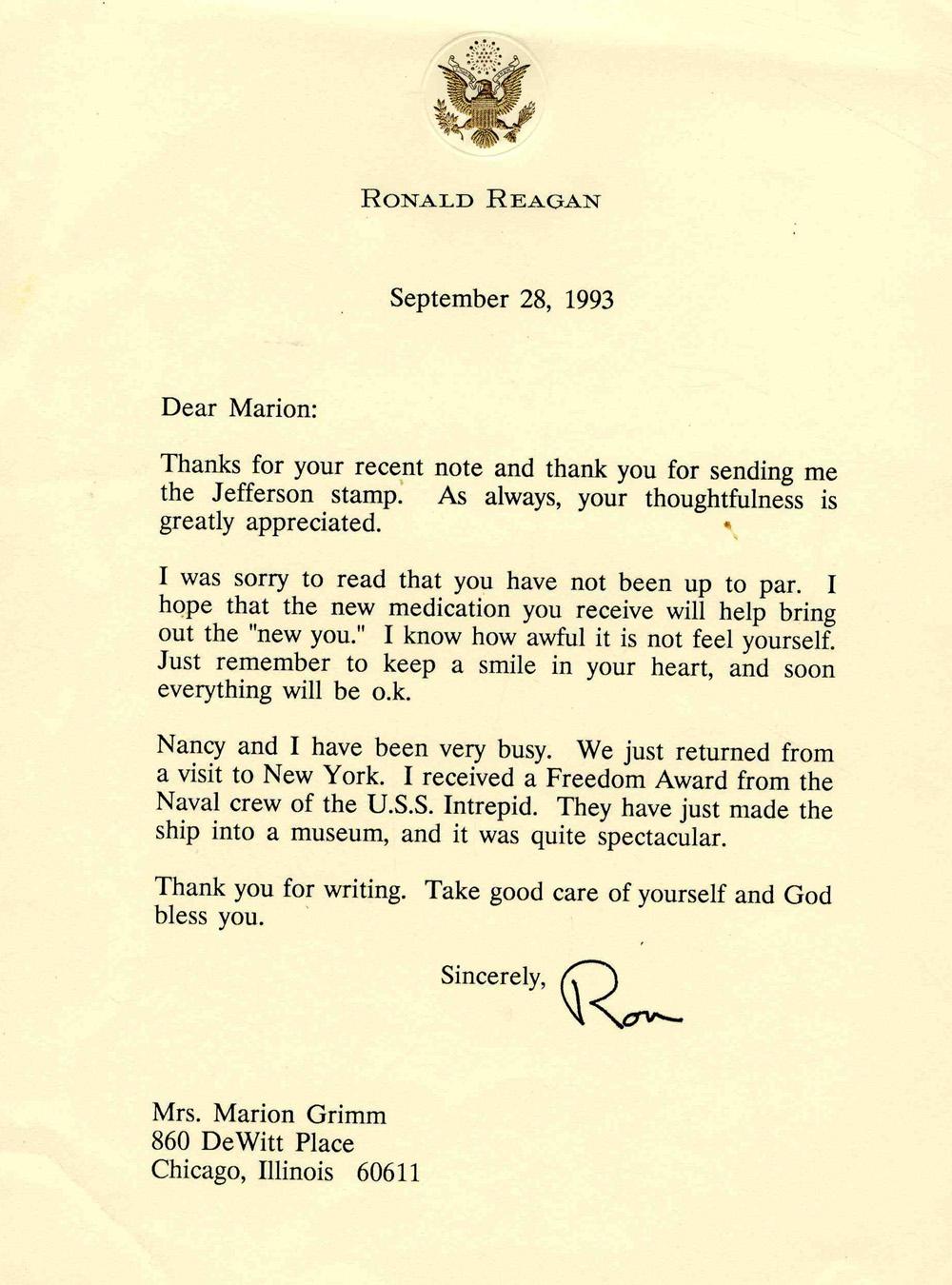 Typed letter signed by Ronald Reagan. Composed on Presidential Seal stationery and dated 28 September 1993, Reagan writes to Marion Grimm, the widow of Chicago Cubs' Charlie Grimm. In part: ''…I was sorry to read that you have not been up to part…Nancy and I have been very busy. We just returned from a visit to New York. I received a Freedom Award from the Naval crew of the U.S.S. Intrepid. They have just made the ship into a museum, and it was quite spectacular…Sincerely, Ron.'' 6.5'' x 8.5'' letter has creasing to corners, else fine.