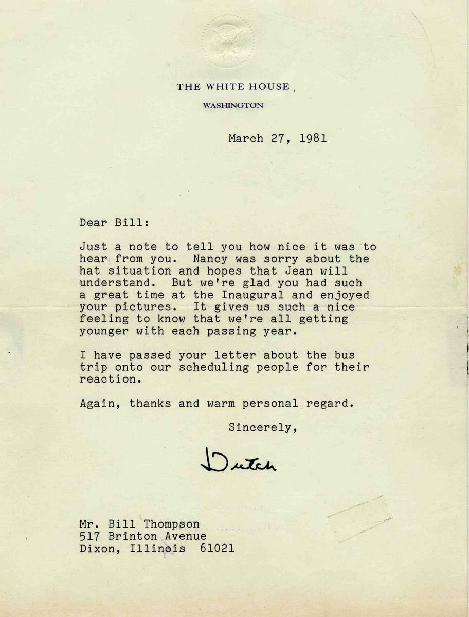 Ronald Reagan typed letter signed ''Dutch'' as President to his close friend Bill Thompson. Written upon White House stationery and dated 27 March 1981, only three days before the attempt on his life. The warm letter contrasts markedly with the coming days. In part, ''we're glad you had such a great time at the Inaugural, it gives us such a nice feeling to know that we're all getting younger with each passing year.'' 6.75'' x 8.75'' letter is in very good condition, accompanied by White House mailing envelope.