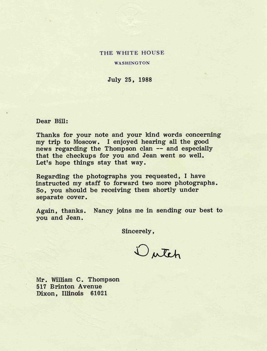 Ronald Reagan typed letter signed ''Dutch'' as President, dated 25 July 1988. Writing to his friend Bill Thompson, ''Thanks for your note and your kind words concerning my trip to Moscow. Regarding the photographs you requested, I have instructed my staff to forward two more photographs.'' 6.75'' x 8.75'' letter is in fine condition.