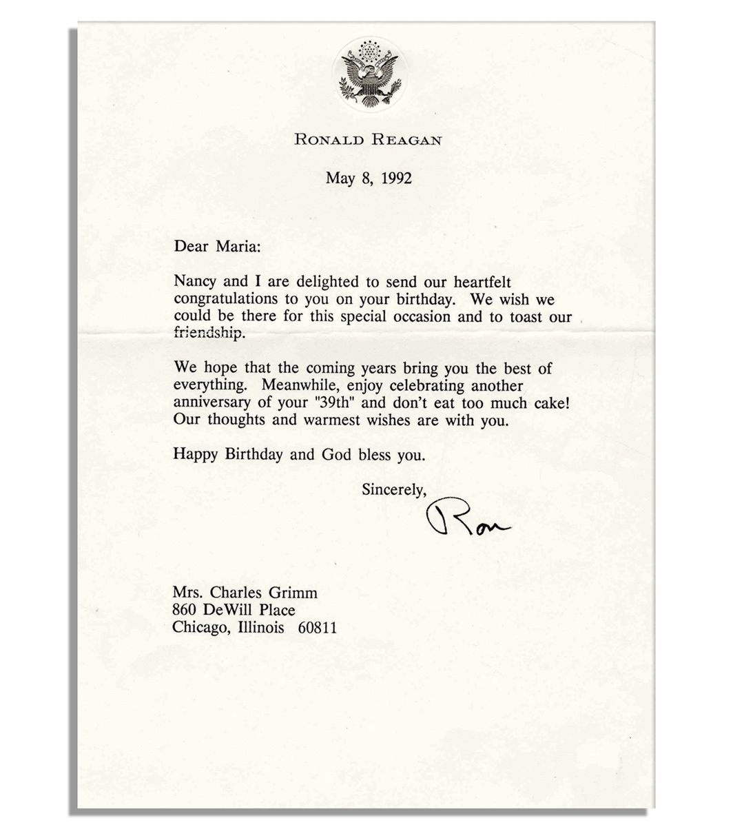 Typed letter signed by Ronald Reagan. Composed upon Presidential Seal stationery and dated 8 May 1992, Reagan writes to Marion Grimm, the widow of Chicago Cubs great, Charlie Grimm. In part: ''...Nancy and I are delighted to send our heartfelt congratulations to you on your birthday. We wish we could be there for this special occasion and to toast our friendship...enjoy celebrating another anniversary of your '39th' and don't eat too much cake!...Happy Birthday and God bless you. Sincerely, Ron''. 6.5'' x 8.5'' letter is in near fine condition.