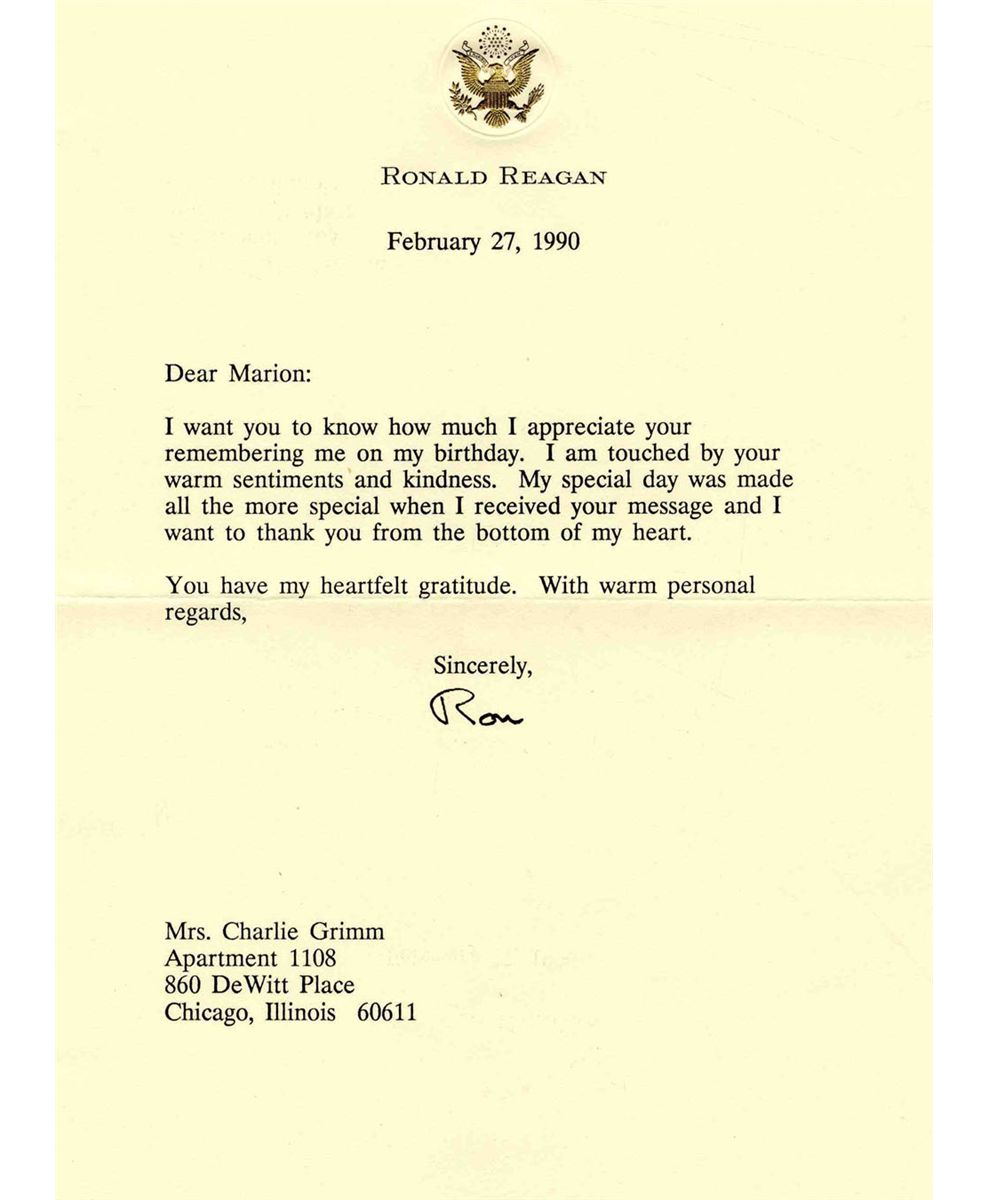 Typed letter signed by Ronald Reagan. Composed on personal stationery and dated 27 February 1990, Reagan writes to Marion Grimm: ''...I appreciate your remembering me on my birthday. I am touched by your warm sentiments and kindness. My special day was made all the more special when I received your message and I want to thank you from the bottom of my heart. You have my heartfelt gratitude. With warm personal regards, Sincerely, Ron''. 6.5'' x 8.5'' letter has one horizontal fold, else near fine. With White House mailing envelope.