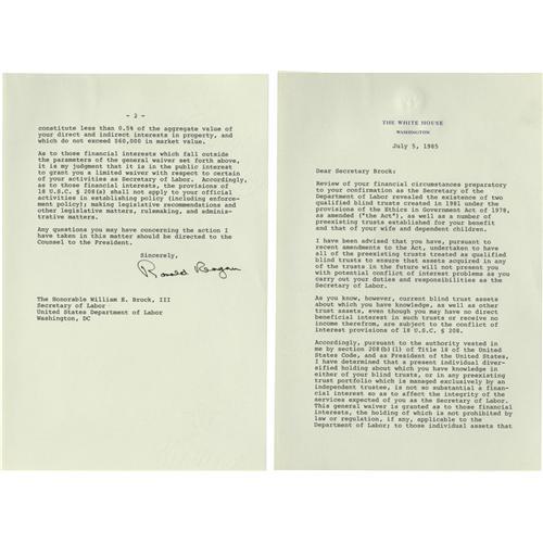 <B> Ronald Reagan Typed Letter Signed,</B></I> "<I> Ronald Reagan</B></I>". 2 pages, 7.0" x 10.5", Washington, D.C., July 5, 1985, to William E. Brock III, Washington, D.C. This letter was composed by Reagan as President to his Secretary of Labor. It reads partially, "<I> Review of your financial circumstances preparatory to your confirmation...revealed the existence of two qualified blind trusts created in 1981 under the provisions of the Ethics in Government Act of 1978...as well as a number of preexisting trusts established for your benefit and that of your wife and dependent children. I have been advised that you have, pursuant to recent amendments to the Act, undertaken to have all of the preexisting trusts treated as qualified blind trusts in the future will not present you with potential conflict of interest problems...as President of the United states, I have determined that a present individual diversified holding about which you have knowledge...is not so substantial a financial interest as to affect the integrity of the services expected of you as the Secretary of Labor...</B></I>". Typed on White House stationery with bold signature. Extra Fine condition.