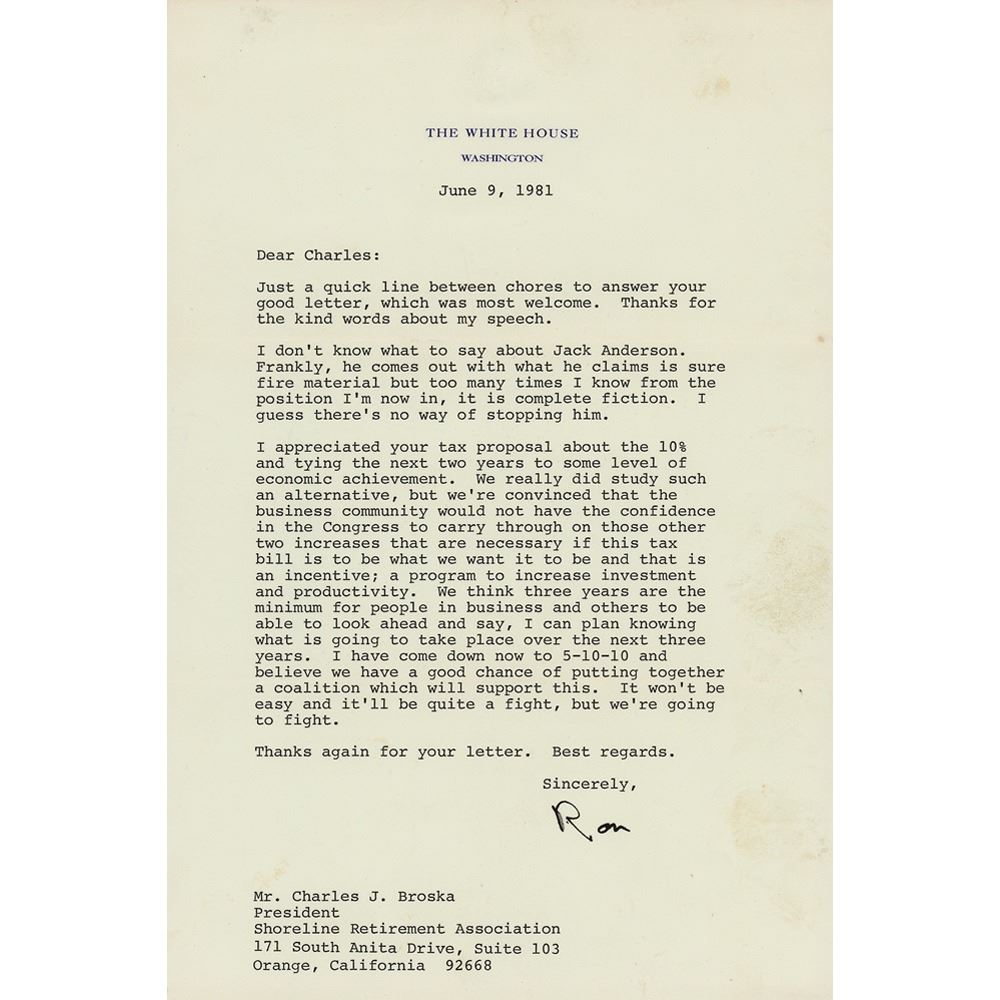 TLS as president, signed “Ron,†one page, 7 x 10.5, White House letterhead, June 9, 1981. Letter to Charles J. Broska, president of the Shoreline Retirement Association, in full: "Just a quick line between chores to answer your good letter, which was most welcome. Thanks for the kind words about my speech. I don’t know what to say about Jack Anderson. Frankly, he comes out with what he claims is sure fire material but too many times I know from the position I’m now in, it is complete fiction. I guess there’s no way of stopping him. I appreciated your tax proposal about the 10% and tying the next two years to some level of economic achievement. We really did study such an alternative, but we’re convinced that the business community would not have the confidence in the Congress to carry through on those other two increases that are necessary if this tax bill is to be what we want it to be and that is an incentive; a program to increase investment and productivity. We think three years are the minimum for people in business and others to be able to look ahead and say, I can plan knowing what is going to take place over the next three years. I have come down now to 5-10-10 and believe we have a good chance of putting together a coalition which will support this. It won’t be easy and it’ll be quite a fight, but we’re going to fight. Thanks again for your letter. Best regards.†In fine condition.