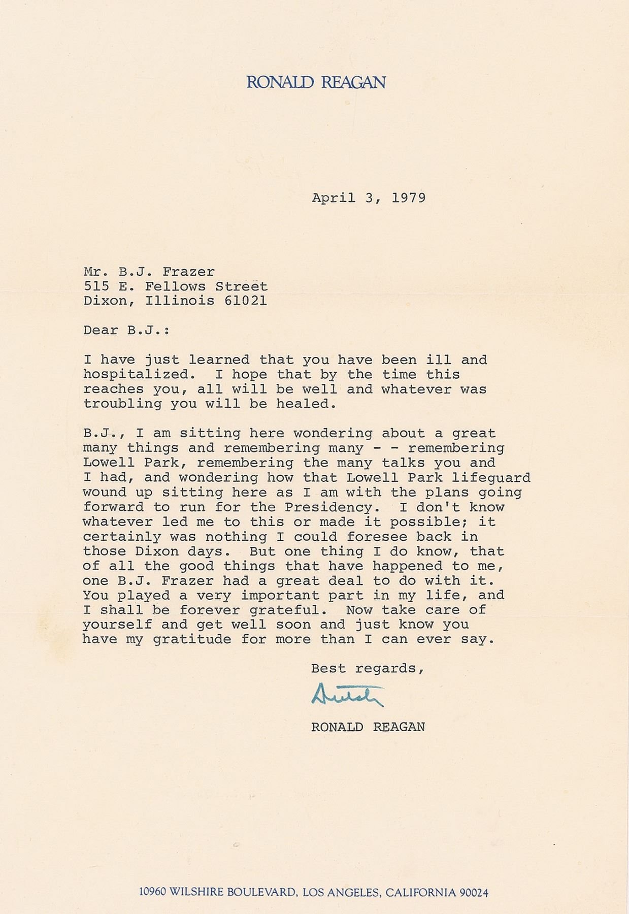 TLS signed “Dutch,” one page, 7.25 x 10.5, personal letterhead, April 3, 1979. Wonderfully touching letter to B. J. Frazer, Reagan's drama coach in high school, in full: "I have just learned that you have been ill and hospitalized. I hope that by the time this reaches you, all will be well and whatever was troubling you will be healed. B. J., I am sitting here wondering about a great many things and remembering many—remembering Lowell Park, remembering the many talks you and I had, and wondering how that Lowell Park lifeguard wound up sitting here as I am with the plans going forward to run for the Presidency. I don't know whatever led me to this or made it possible; it certainly was nothing I could foresee back in those Dixon days. But one thing I do know, that of all the good things that have happened to me, one B. J. Frazer had a great deal to do with it. You played a very important part in my life, and I shall be forever grateful. Now take care of yourself and get well soon and just know you have my gratitude for more than I can ever say." In fine condition.