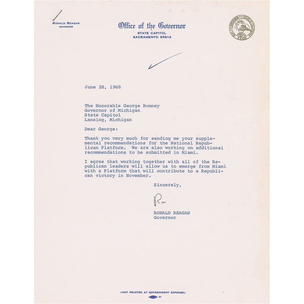 TLS signed “Ron,” one page, 8.5 x 11, Office of the Governor letterhead, June 28, 1968. Letter to Michigan Governor George W. Romney, in full: "Thank you very much for sending me your supplemental recommendations for the National Republican Platform. We are also working on additional recommendations to be submitted in Miami. I agree that working together with all of the Republican leaders will allow us to emerge from Miami with a Platform that will contribute to a Republican victory in November." In fine condition.