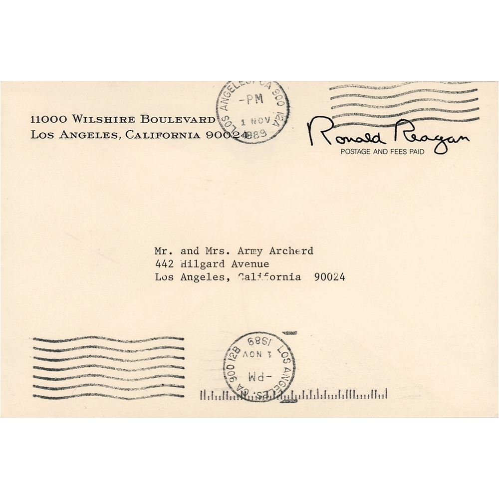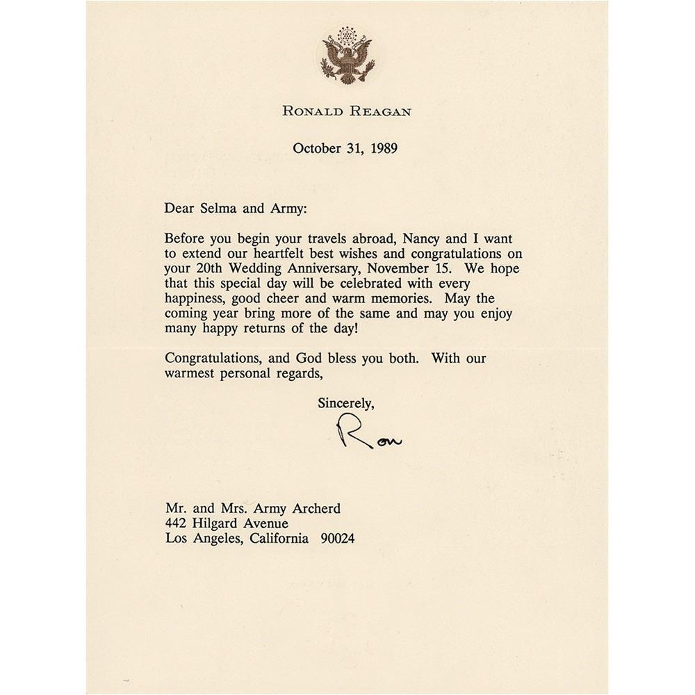 TLS signed “Ron,†one page, 6.25 x 8.5, personal presidential seal letterhead, October 31, 1989. Letter to longtime Variety columnist Army Archerd and his wife, Selma, in part: “Before you begin your travels abroad, Nancy and I want to extend our heartfelt best wishes and congratulations on your 20th Wedding Anniversary, November 15. We hope that this special day will be celebrated with every happiness, good cheer and warm memories. May the coming year bring more of the same and may you enjoy many happy returns of the day!†In fine condition. Accompanied by the original mailing envelope with preprinted free frank and a full letter of authenticity from JSA.