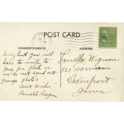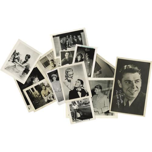 <B>Ronald Reagan Vintage Snapshots.</B></I> A set of 13 rare, vintage b&w snapshots of the actor-turned-politician, ranging in size from 1.75" x 2.5" to 4" x 5" -- including a postcard postmarked July 9, 1940, inscribed and signed by Reagan in black ink. Many of them feature Reagan in uniform and/or with his then-wife Jane Wyman. In the pool, by his car - this is a nice, candid assortment from the "other" life and career of the future U.S. President. The photos are in overall Excellent condition with only some instances of very light wear.<BR><BR><b>Shipping:</b> Small Flat (<a target="_blank" href="http://www.heritageauctions.com/common/shipping.php">view shipping information</a>)