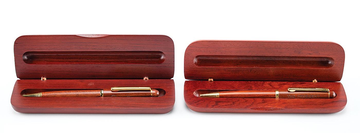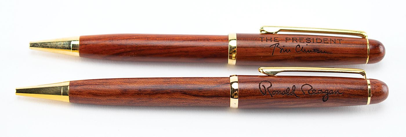 Two wooden pens, one engraved with Ronald Reagan's facsimile signature and the other engraved with Bill Clinton's facsimile signature. Both are housed in their original wooden cases, also engraved on the lids with the seal of the president of the United States and their facsimile signatures. In overall fine condition.