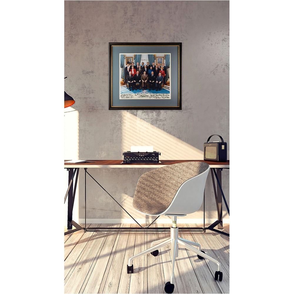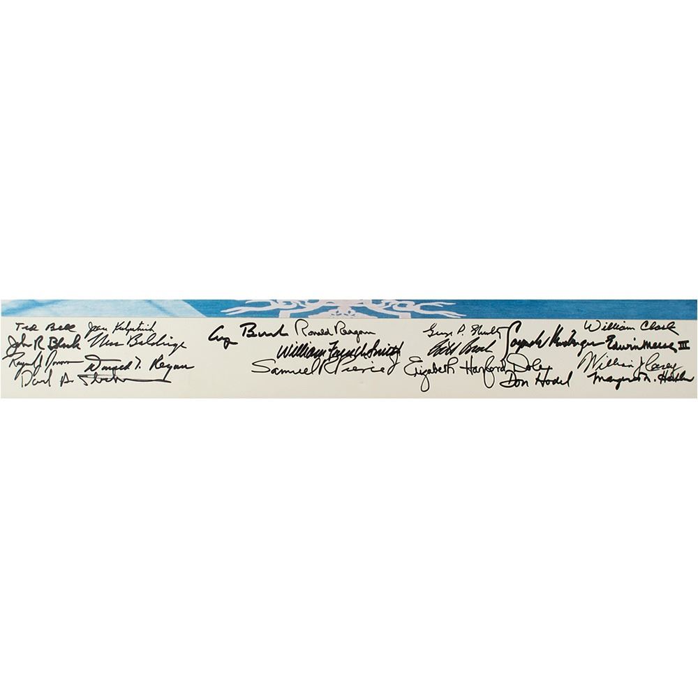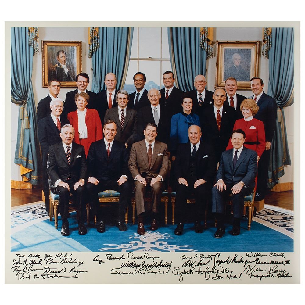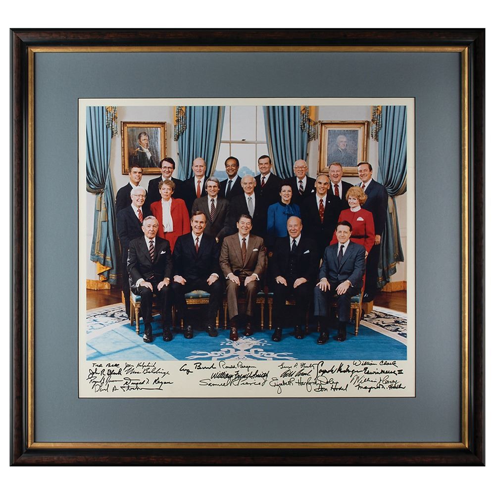 Impressive color satin-finish 20 x 16 replacement photo of President Reagan in the White House with his 1985 cabinet and top advisors, affixed to its original 21 x 18.75 mount, signed on the mount in black felt tip by all pictured: Ronald Reagan, George Bush, Terrel H. Bell, John R. Block, Raymond J. Donovan, David Stockman, Malcolm Baldrige, Jeane Kirkpatrick, Donald T. Regan, William French Smith, Samuel R. Pierce, George P. Schultz, Elizabeth Dole, William Brock, Caspar W. Weinberger, Donald P. Hodel, William Clark, Margaret M. Heckler, William J. Casey, and Edwin Meese. Matted and framed to an overall size of 30 x 27.5. In fine condition, with a small ding to the lower blank area of the mount.