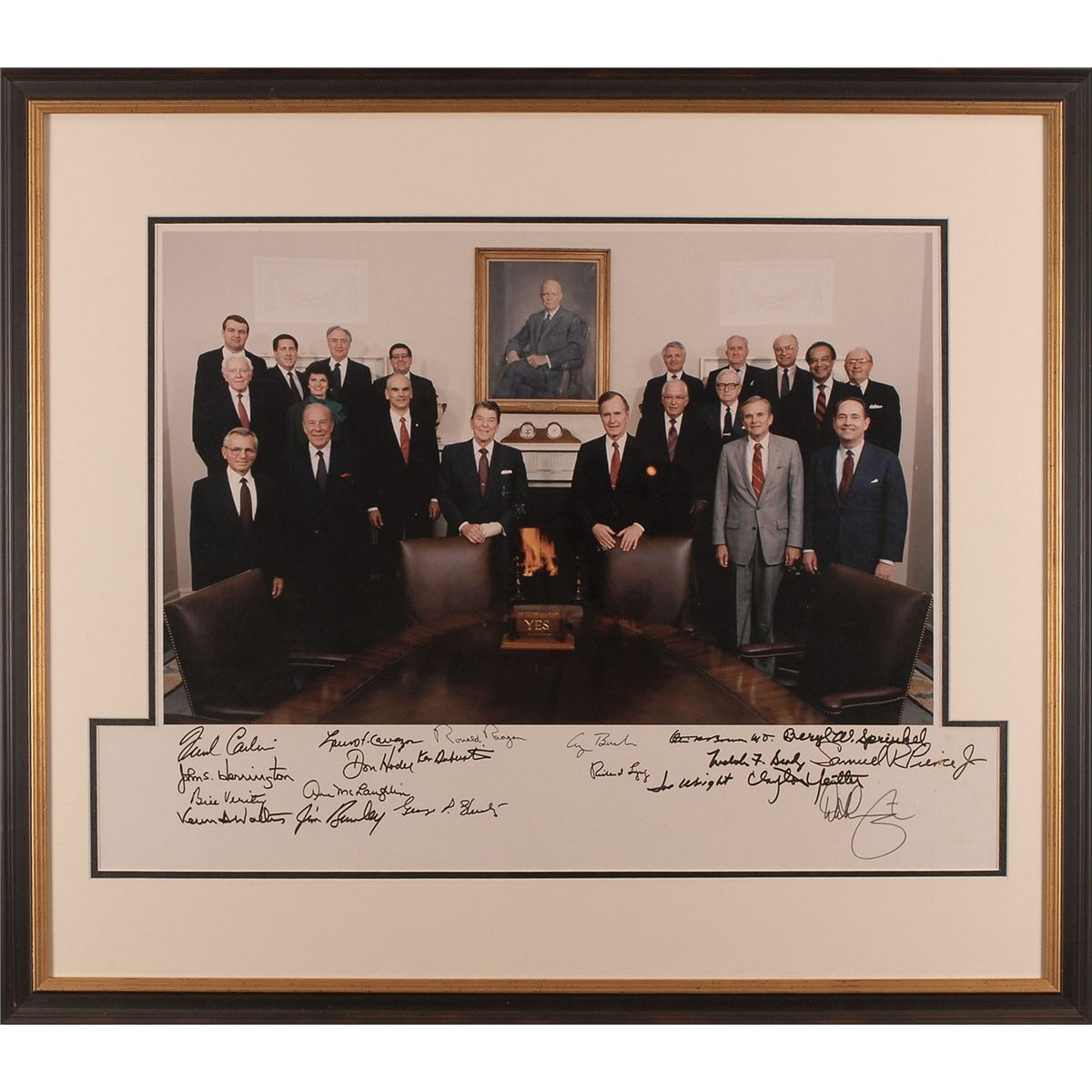 Color satin-finish 23.25 x 16.25 photo of Reagan and his cabinet posing together below a portrait of Eisenhower, signed in the lower border in black felt tip by by Ronald Reagan, George Bush, George P. Shultz, Frank Carlucci, Bill Verity, Jim Burnley, Lauro Cavazos, Don Hodel, Ken Duberstein, Ann McLaughlin, Richard Lyng, John S. Herrington, Joseph Wright, Vernon Walters, Clayton Yeutter, Nicholas Brady, Dick Thornburgh, Samuel Pierce, Otis Bowen, and Beryl Sprinkel. Attractively double-matted and framed to an overall size of 28.25 x 24.5. In fine condition, with some light soiling to the right border, slightly affecting one signature. A highly desirable and scarce example—just the second we have encountered. Oversized.