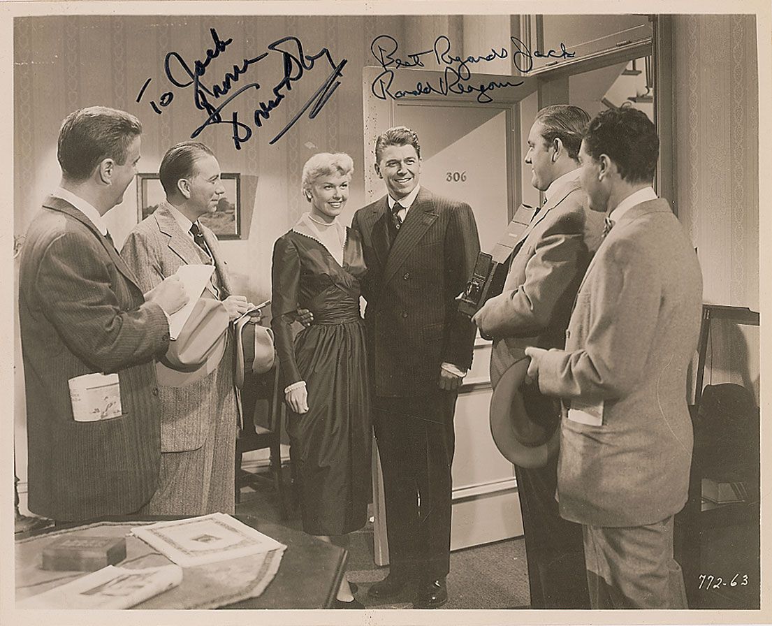 Glossy 9.75 x 8 photo of a scene from Storm Warning, signed and inscribed in black felt tip, “Best Regards Jack, Ronald Reagan,” and “To Jack, from Doris Day.” In fine condition, with some central spotting to surface. Though the pair appeared in three films together between 1949 and 1952—It’s a Great Feeling, Storm Warning, and The Winning Team—items signed by both are quite rare.