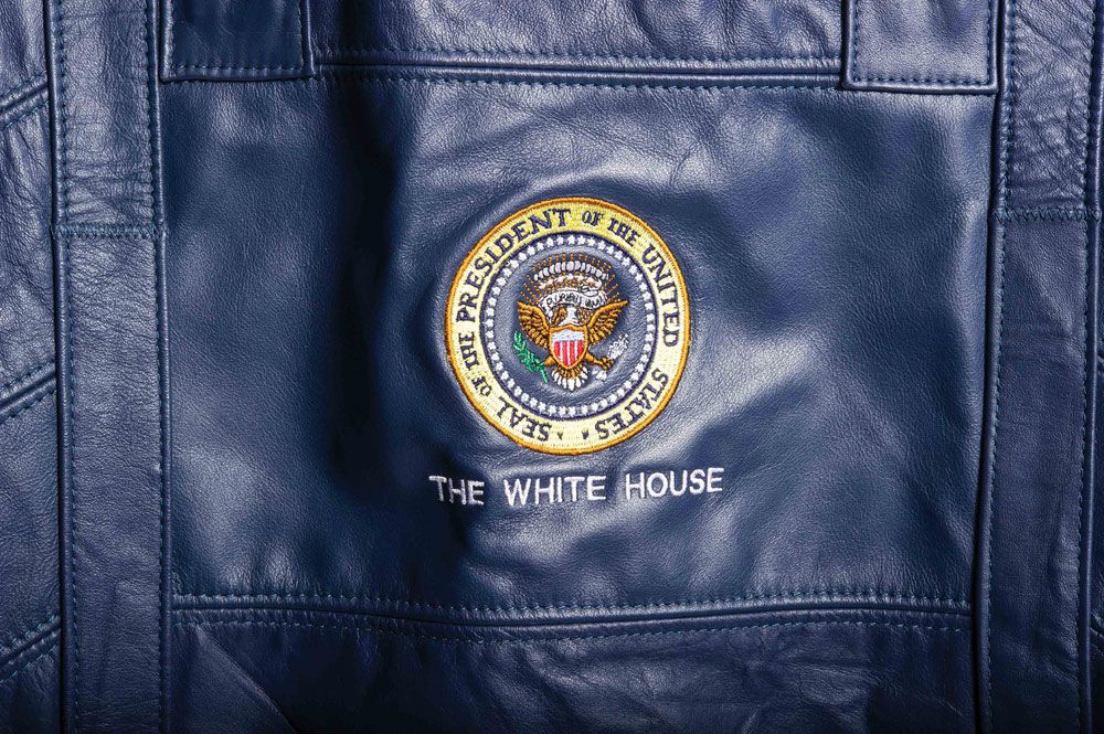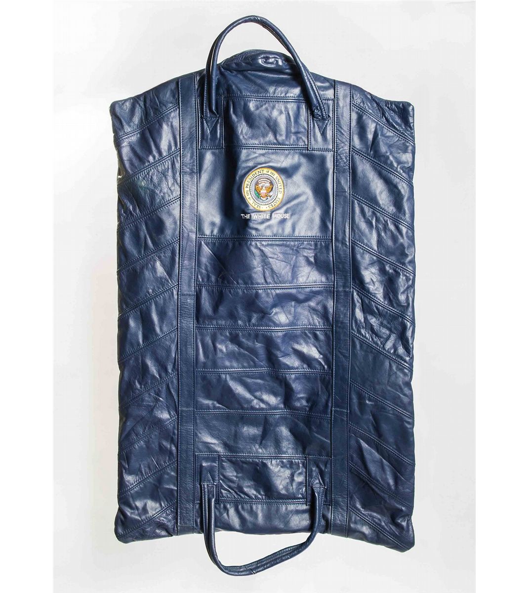 Very nice, superior quality blue leather Reagan–Bush White House garment bag, measuring approximately 24 x 36, with a zip-up front, four smaller zip-up pockets, two carrying handles, and impressively detailed embroidered color presidential seal and “The White House” embroidered on the front. In very fine condition. A splendid offering.