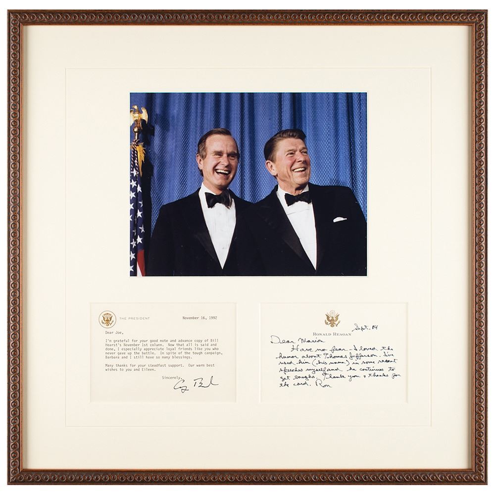 Pair of letters from Ronald Reagan and George Bush: an ALS signed "Ron," one page, 6 x 4, personal stationery with embossed presidential seal, September 14 (no year), addressed to Marion Grimm, in full: "Have no fear—I loved the humor about Thomas Jefferson. I've used him (his name) in some recent speeches myself and he continues to get laughs. Thank you & thanks for the card"; and a TLS as president, signed "George Bush," one page, The President stationery card, 6 x 4, November 16, 1992, addressed to Joe, in full: "I'm grateful for your good notes and advance copy of Bill Hearst's November 1st column. Now that all is said and done, I especially appreciate loyal friends like you who never gave up the battle. In spite of the tough campaign, Barbara and I still have so many blessings. Many thanks for your steadfast support. Our warm wishes to you and Eileen." Matted and framed together with a photo of the two former presidents to an overall size of 19.75 x 19.5. In overall very fine condition. Accompanied by the original mailing envelopes. Marion Grimm was the wife of former professional baseball player Charlie Grimm, who played first base for the Chicago Cubs for several seasons.