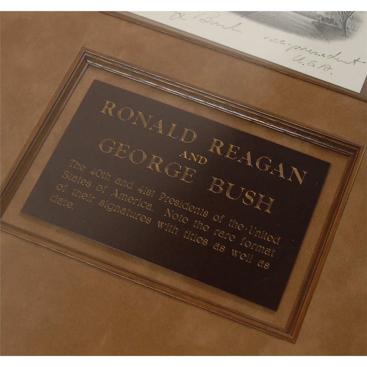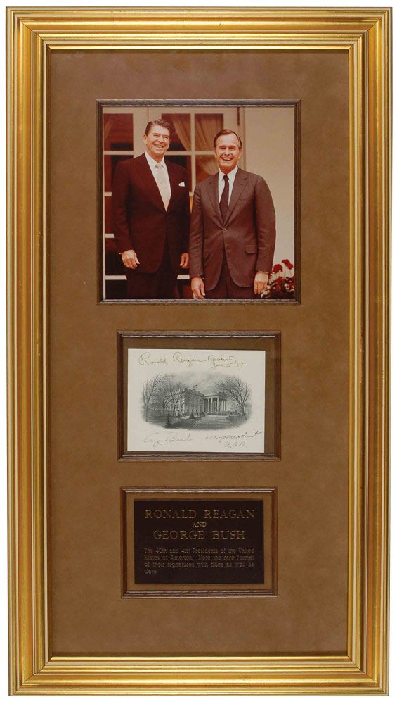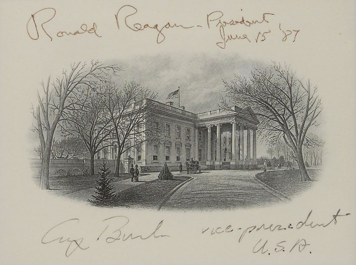 Rare engraved vignette portrait of the exterior of the White House, 5 x 3.75, signed in black ink as president, “Ronald Reagan, President, June 15 ’87” and as vice president, “George Bush, vice-president, U. S. A.” Handsomely archivally suede-matted and framed to an overall size of 15 x 26.5. In very fine condition. A scarce and desirable uninscribed engraving, signed by both Republican executives during the defining presidential administration of the 1980s—these are virtually impossible to find with the added “president” and “vice-president” titles, and as such this example is of the utmost desirability. Although the vignette is a familiar format, we have never encountered anything comparing to this historically inscribed piece.