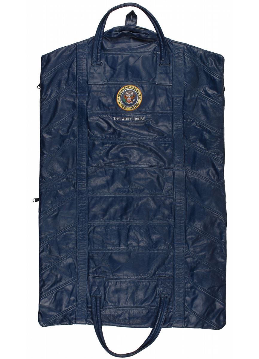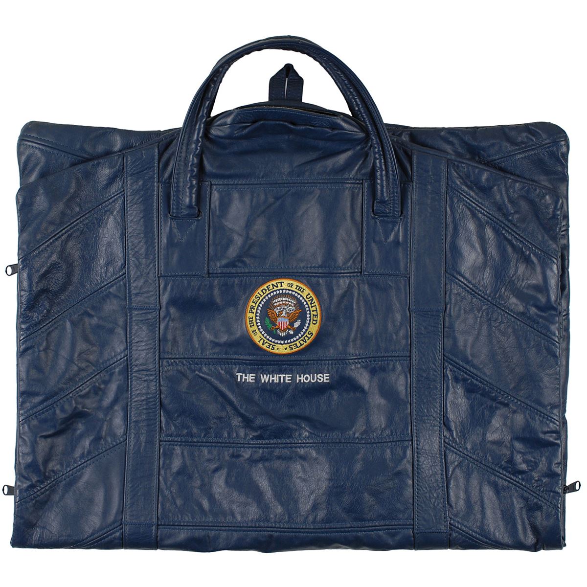 Exceptional quality navy blue leather Reagan–Bush White House garment bag, measuring approximately 24 x 36, with a zip-up front, four smaller zip-up pockets, two carrying handles, and impressively detailed embroidered color presidential seal and “The White House” embroidered on the front. In very fine condition. The consignor of this piece worked in Washington radio journalism during the 1970s and 1980s. He obtained this bag from a White House staffer who purchased it through the White House gift shop, which at the time was not open to the general public.