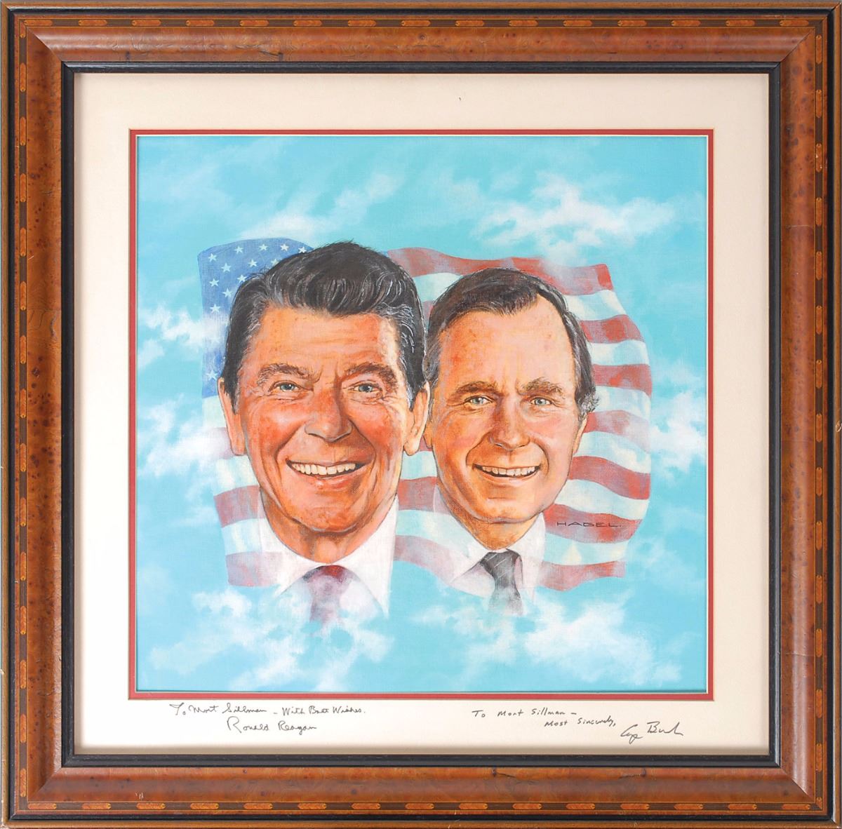 Impressive oversized color canvas print of Reagan and Bush, matted and framed to an overall size of 28.75 x 28, signed and inscribed on the mat in black felt tip, “To Mort Sillman—with best wishes, Ronald Reagan” and “To Mort Sillman—Most sincerely, George Bush.” In fine condition. Oversized.