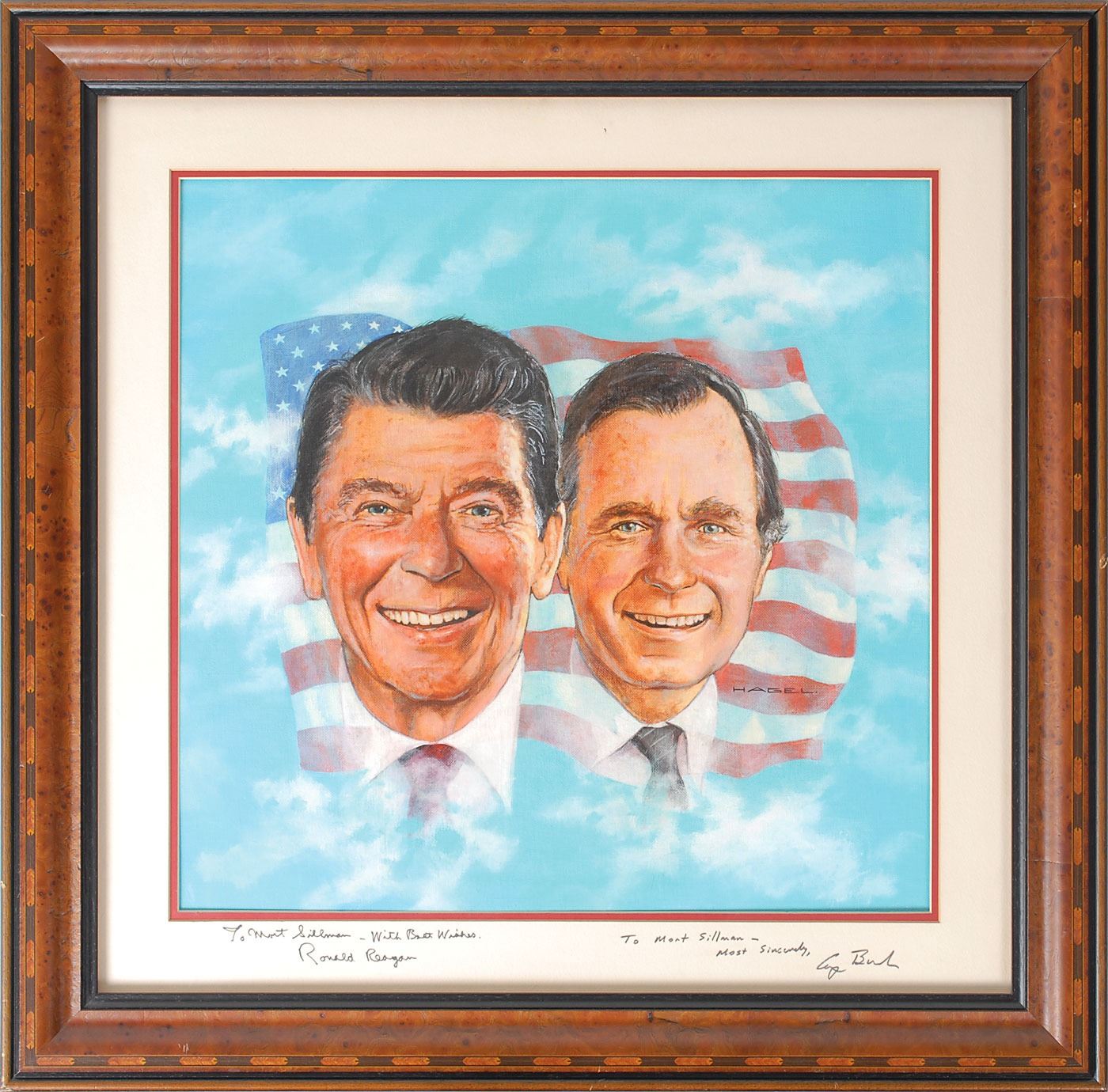 Impressive oversized color canvas print of Reagan and Bush, matted and framed to an overall size of 28.75 x 28, signed and inscribed on the mat in black felt tip, “To Mort Sillman—with best wishes, Ronald Reagan” and “To Mort Sillman—Most sincerely, George Bush.” In fine condition.