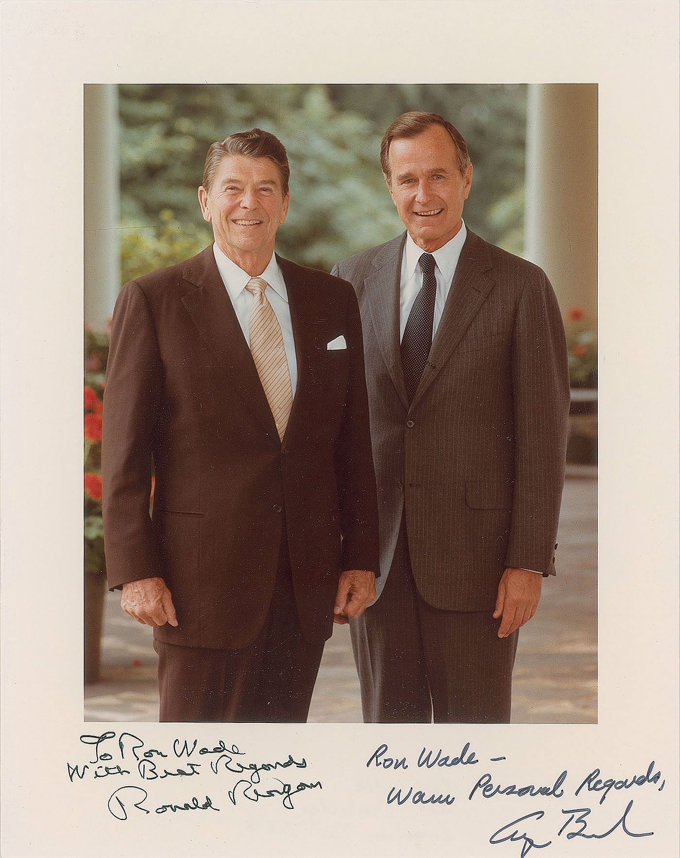 Wonderful color satin-finish 8 x 10 three-quarter-length photo of Reagan and Bush, signed and inscribed in black ink as president, "To Ron Wade, With Best Regards, Ronald Reagan," and in black felt tip as vice president, "Ron Wade—Warm Personal Regards, George Bush.” In fine condition. The recipient, Ron Wade, was a floor leader at the 1988 Republican National Convention and was later appointed by Bush to his Presidential Inaugural Committee. He served as the regional director for Bush's campaign races in 1980, 1988, and 1992.