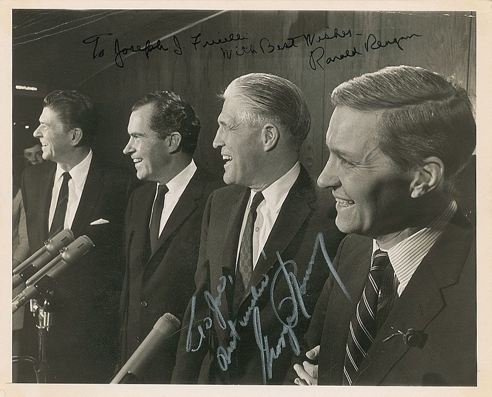 Matte-finish 9.75 x 8 press photo of Reagan, Romney, and Richard Nixon posing together, signed and inscribed in black ink “To Joseph J. Fricelli, With best wishes, Ronald Reagan,” and signed and inscribed in white artist’s pencil, “To Joe, Best wishes, George Romney.” Scattered creasing, mainly to top edge and lower right corner, otherwise fine condition.