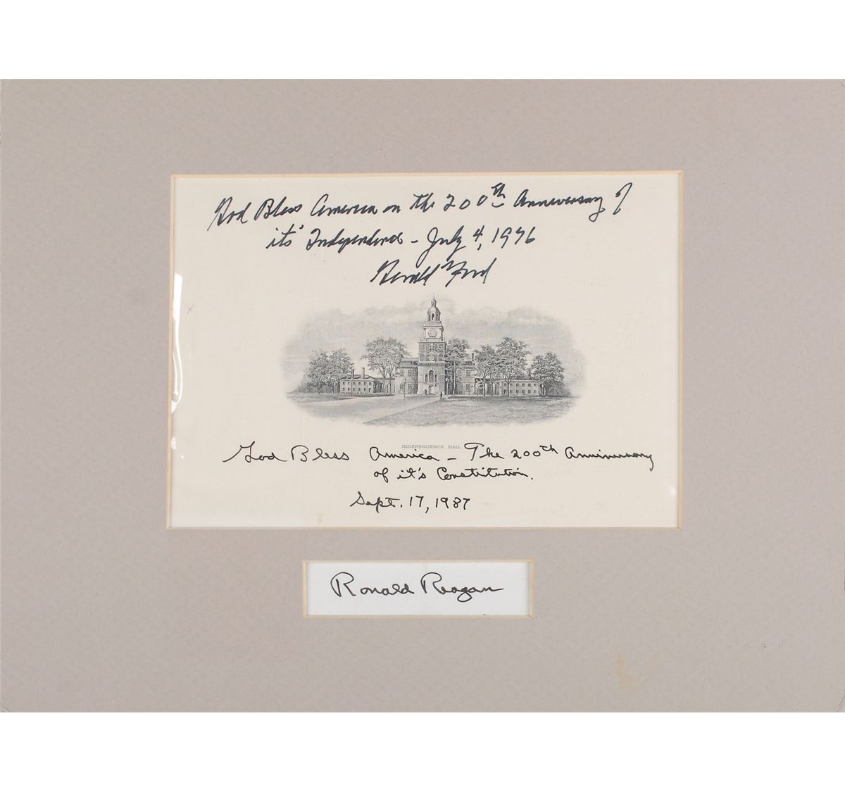 Fantastic engraving of Independence Hall in Philadelphia, 7 x 5, notated below the vignette image in black felt tip by Reagan, “God bless America—the 200th Anniversary of it’s Constitution, Sept. 17, 1987,” and signed and notated at the top by Ford, “God bless America on the 200th anniversary of its’ Independence—July 4th, 1976, Gerald Ford.” Matted with a felt tip signature, “Ronald Reagan,” to an overall size of 12 x 9. In fine condition, with a crease and slight surface loss to the bottom edge of the engraving.
