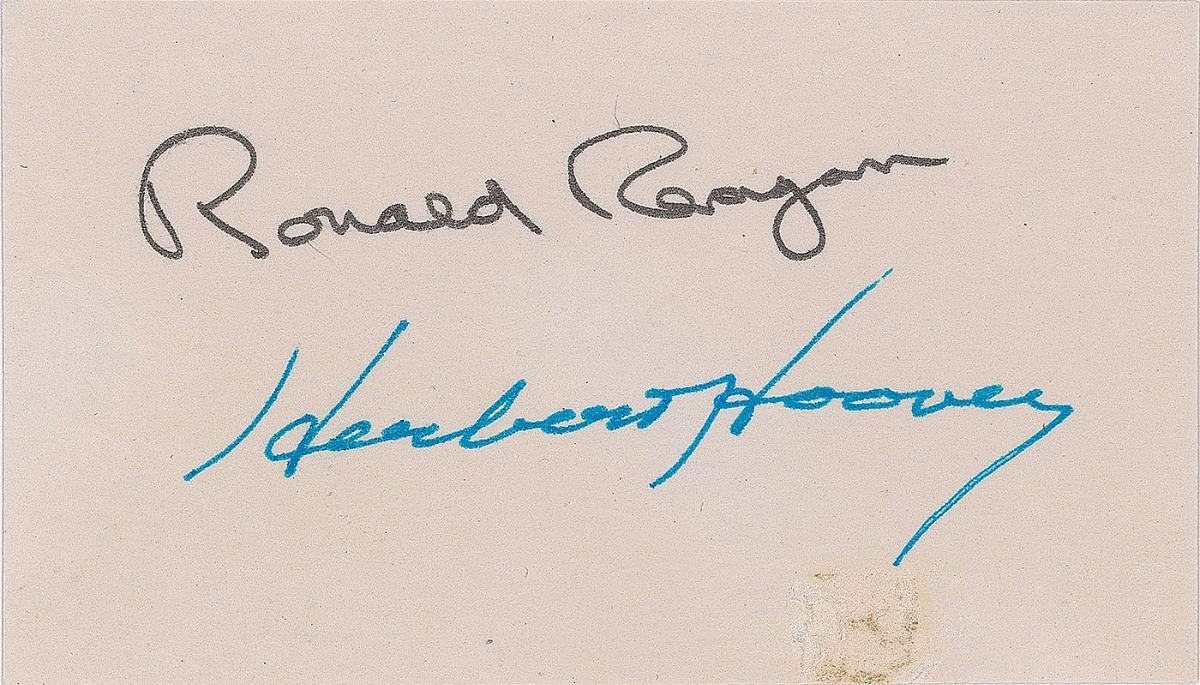 Black ink signature of Ronald Reagan and a blue ink signature of Herbert Hoover on an off-white 3.5 x 2 card. In fine condition, with surface loss to lower edge.