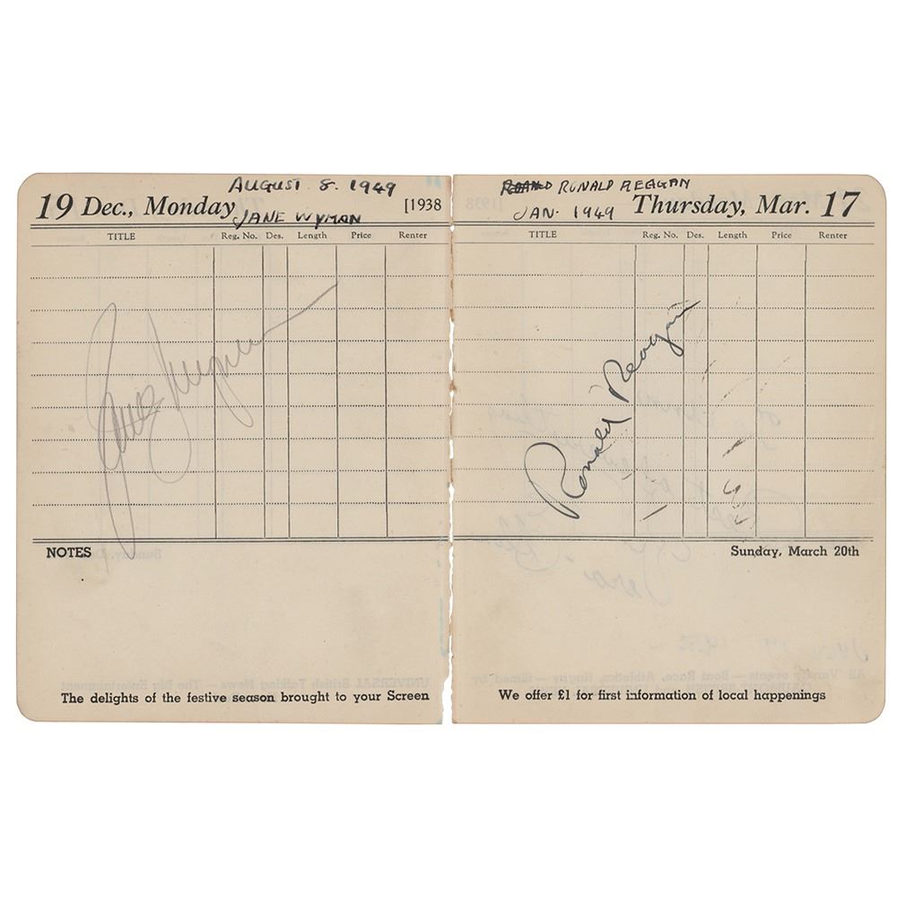 Pair of off-white 4.5 x 5.5 pages removed from a daily ledger, individually signed in fountain pen, "Ronald Reagan," and in pencil, "Jane Wyman," with the reverse of the Reagan page also signed by Vera-Ellen. The Reagan page is dated to January 1949, and the Wyman page to August 8, 1949, the year their divorce was finalized. In overall fine condition, with light show-through from the Vera-Ellen signature on the back of the Reagan sheet.