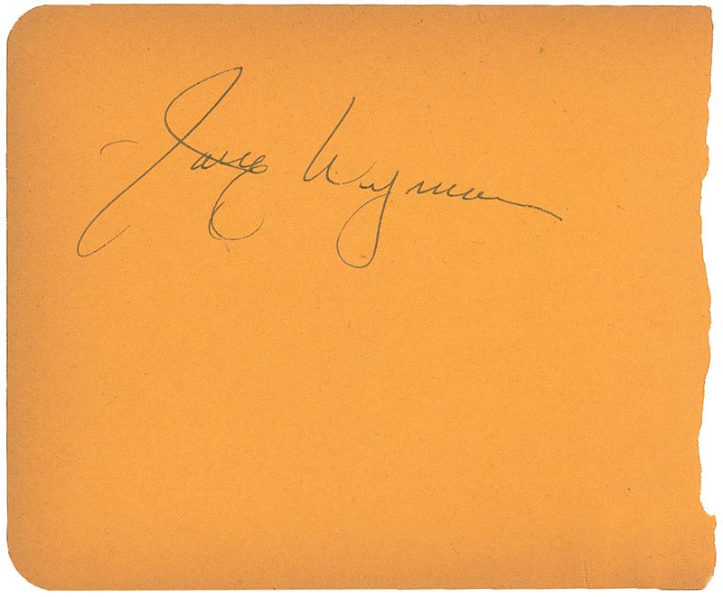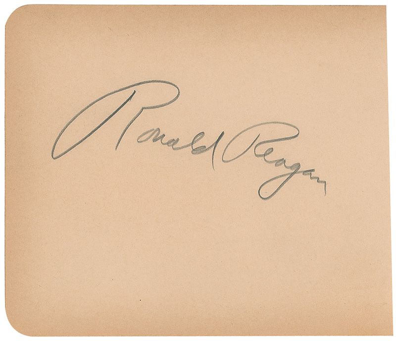 Vintage pencil signature, “Ronald Reagan,” on an off-white 5.25 x 4.5 album page; and a vintage ink signature, “Jane Wyman,” on a tan 5.25 x 4.5 album page. In fine condition, with some light edge toning.