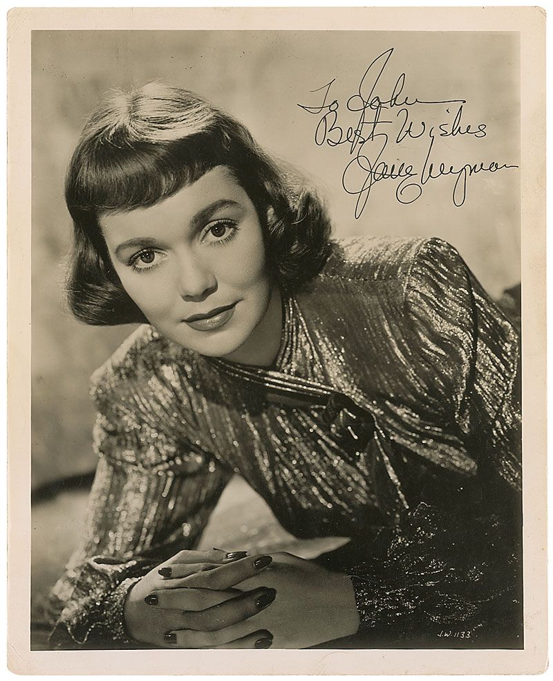 Vintage glossy 8 x 10 head-and-shoulders of Reagan from his acting days, signed and inscribed in fountain pen, “Good luck John, Ronald Reagan”; and a vintage glossy 8 x 10 of Wyman in a shimmering gown, signed and inscribed in black ink, “To John, Best wishes, Jane Wyman.” In fine condition.