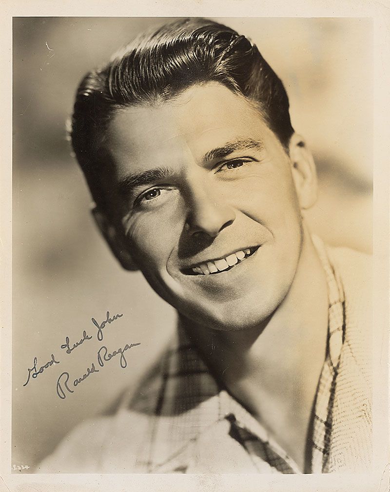 Vintage glossy 8 x 10 head-and-shoulders of Reagan from his acting days, signed and inscribed in fountain pen, “Good luck John, Ronald Reagan”; and a vintage glossy 8 x 10 of Wyman in a shimmering gown, signed and inscribed in black ink, “To John, Best wishes, Jane Wyman.” In very good to fine condition, with scattered creases and an area of mild discoloration to Reagan’s face.
