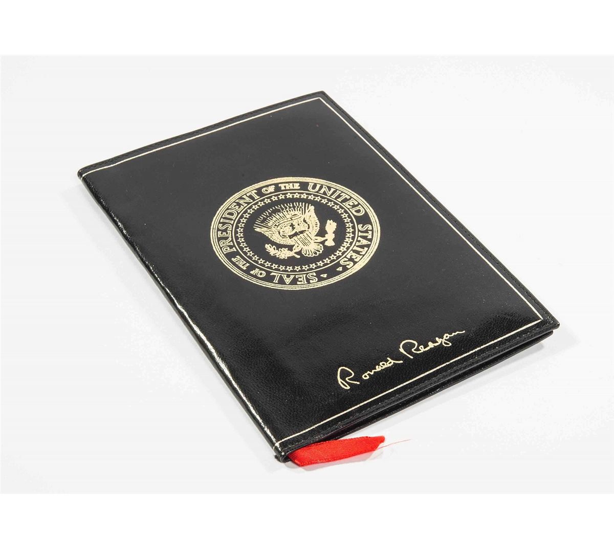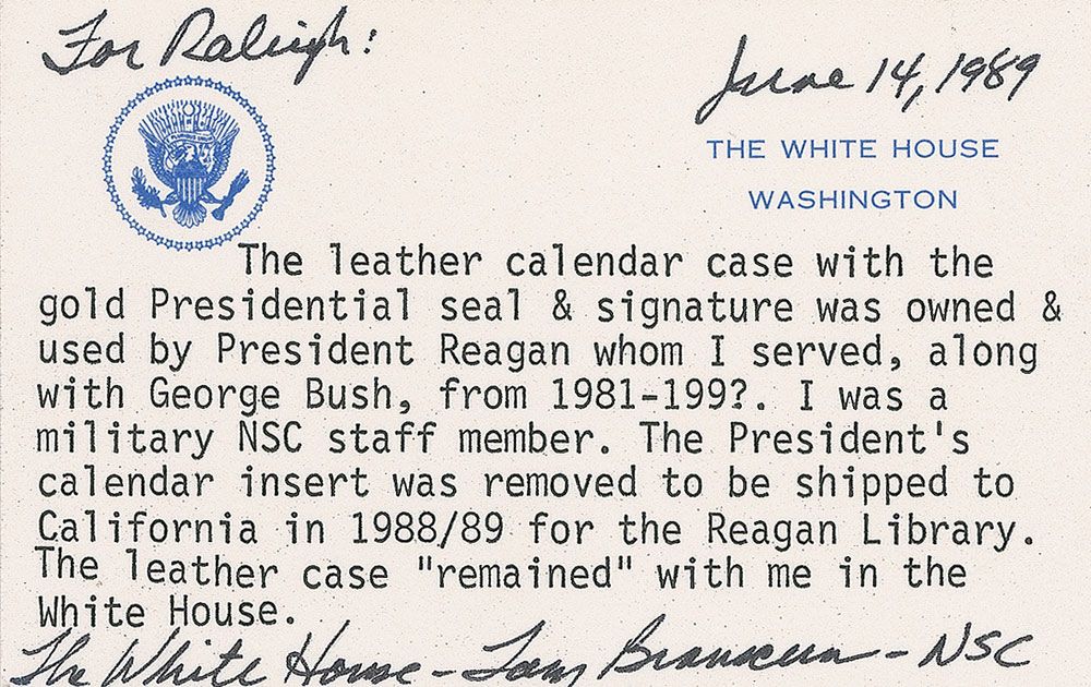 President Reagan’s personally-owned and -used black Abercrombie & Fitch black leather calendar folder, 5.25 x 7.75, gilt-stamped on the front with the Seal of the President of the United States and President Ronald Reagan’s facsimile signature. Includes a letter of provenance on a White House card from Larry Branscum. In part: “The leather calendar case with the gold Presidential seal & signature was owned & used by President Reagan whom I served, along with George Bush…I was a military NSC staff member. The President’s calendar insert was removed to be shipped to California in 1988/89 for the Reagan Library. The leather case ‘remained’ with me in the White House.” A superb example, personally-used by the iconic Republican president.