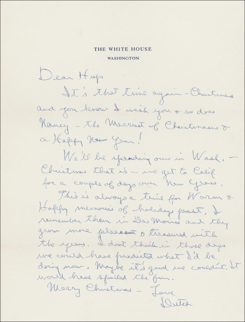 Rare ALS as president signed “Dutch,” one page, 6.75 x 9, pale green White House letterhead, no date, but postmarked December 7, 1981. A letter to his longtime friend Lydia “Hup” MacArthur. In full: “It’s that time again–Christmas and you know I wish you & so does Nancy–the Merriest of Christmases & a Happy New Year! We’ll be spending ours in Wash.–Christmas that is–we get to Calif. for a couple of days over New Years. This is always a time for Warm & Happy memories of holidays past. I remember them in Des Moines and they grew more pleasant & treasured with the years. I don’t think in those days we could have predicted what I’d be doing now. Maybe it’s good we couldn’t. It would have spoiled the fun. Merry Christmas, Love, Dutch.” In clean, fine condition.