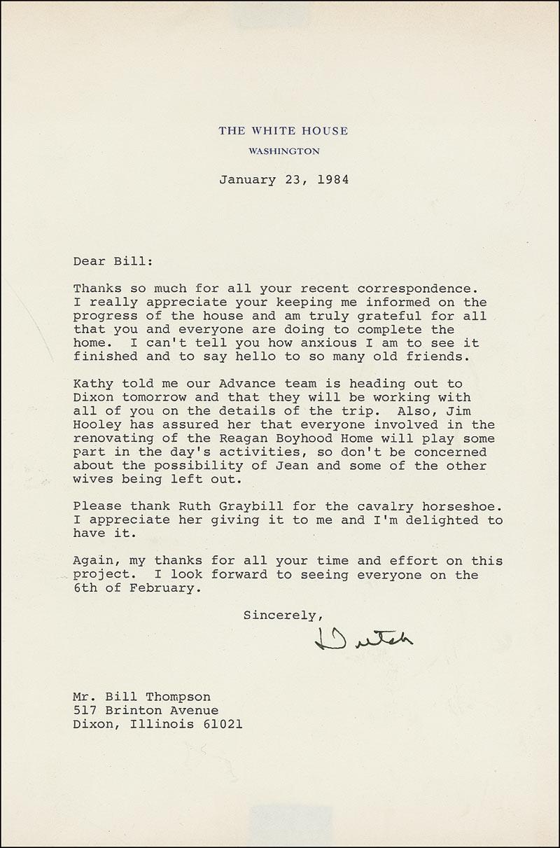 TLS as president signed “Dutch,” one page, 7 x 10.5, White House letterhead, January 23, 1984. Letter to his friend Bill Thompson. In full: “Thanks so much for all your recent correspondence. I really appreciate your keeping me informed on the progress of the house and am truly grateful for all that you and everyone are doing to complete the home. I can’t tell you how anxious I am to see it finished and to say hello to so many old friends.