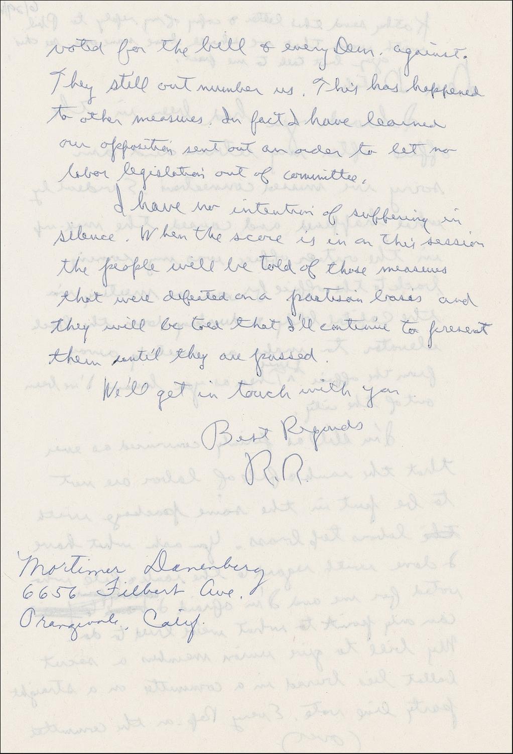 ALS signed “R.R.,” one page both sides, 6 x 9, June 29, 1967. Handwritten draft addressed to “Dutch,” Mortimer Daneberg. In part: “I heard you had been in the office after my return and am sorry we missed connections. Evidently what happened and caused the mix-up in the outer office was my coming back to the office from a meeting in the Capitol bldg & ducking down the back elevator to make a meeting away from the office…I’m still as firmly convinced as ever that the rank & file of labor are not to be put in the same package with labors top brass. You ask what have I done with regard to the rank and file who voted for me and I’m afraid I can only point to what we’ve tried to do. My bill to give union members a secret ballot lies buried in a committee on a straight party line vote. Every Rep. on the committee voted for the bill & every Dem. against. They still out number us. This has happened to other measures. In fact I have learned our opposition sent out an order to let no labor legislation out of committee. I have no intention of suffering in silence. When the people will be told of these measures that were defeated on a partisan basis and they will be told that I’ll continue to present them until they are passed.” In fine condition.