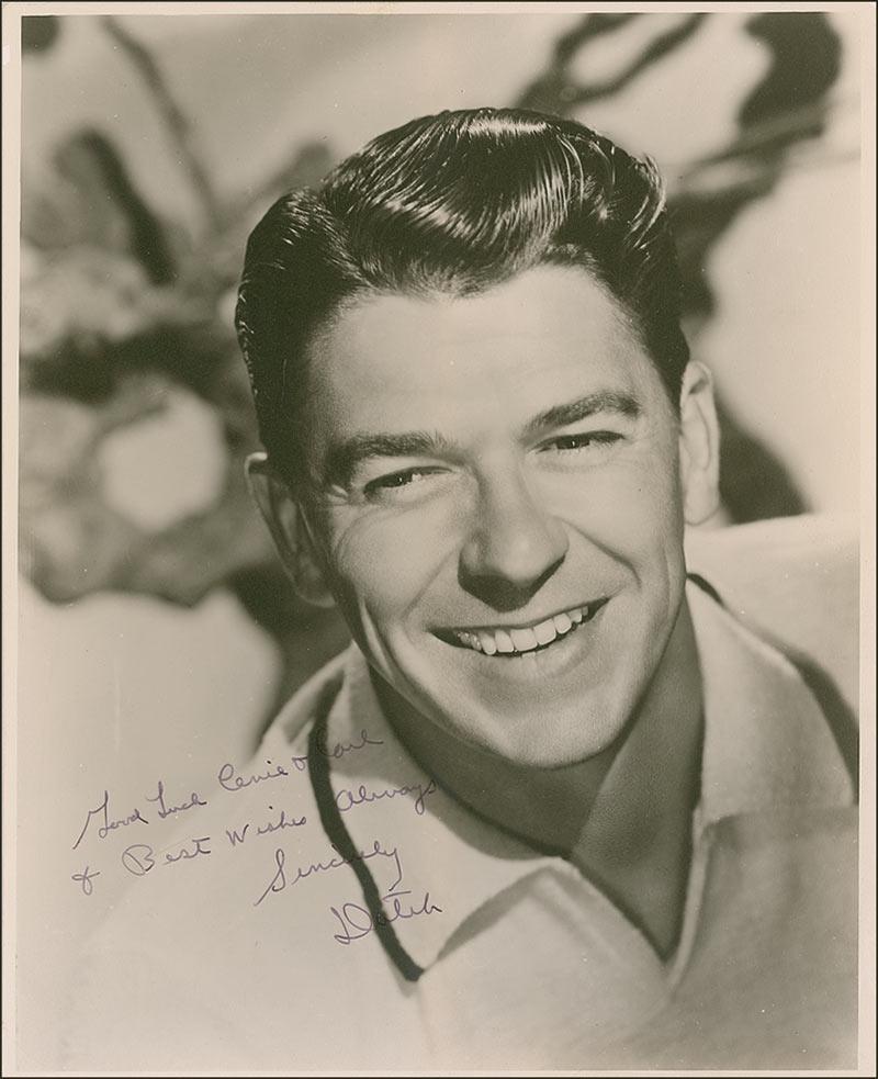 Vintage matte-finish 8 x 10 head-and-shoulders photo, signed and inscribed in fountain pen “Good luck Cenie & Carl & best wishes always, Sincerely, Dutch.” In fine condition, with a bit of scattered light silvering to darker areas.