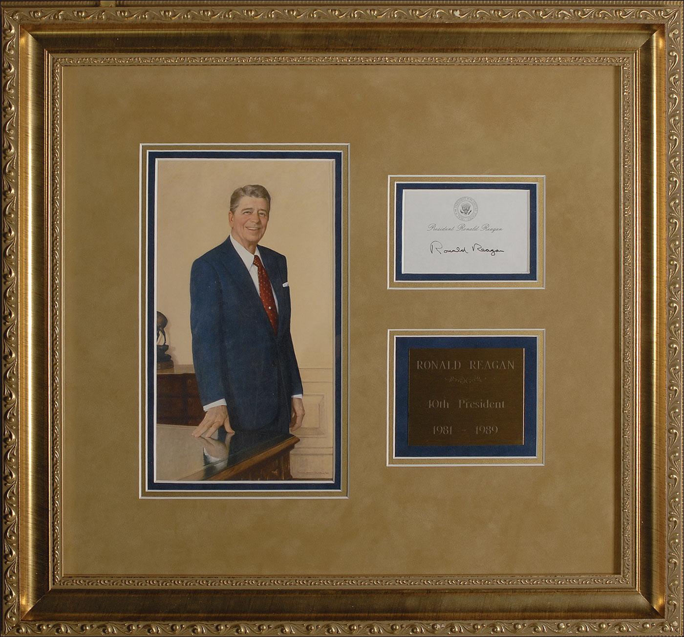 Ink signature, “Ronald Reagan,” on Reagan’s personal off-white 4 x 3 “Post-It” sheet with printed presidential seal. Triple suede matted and framed with a small plaque and a color portrait of Reagan to an overall size of 21 x 19.5. In very fine condition.