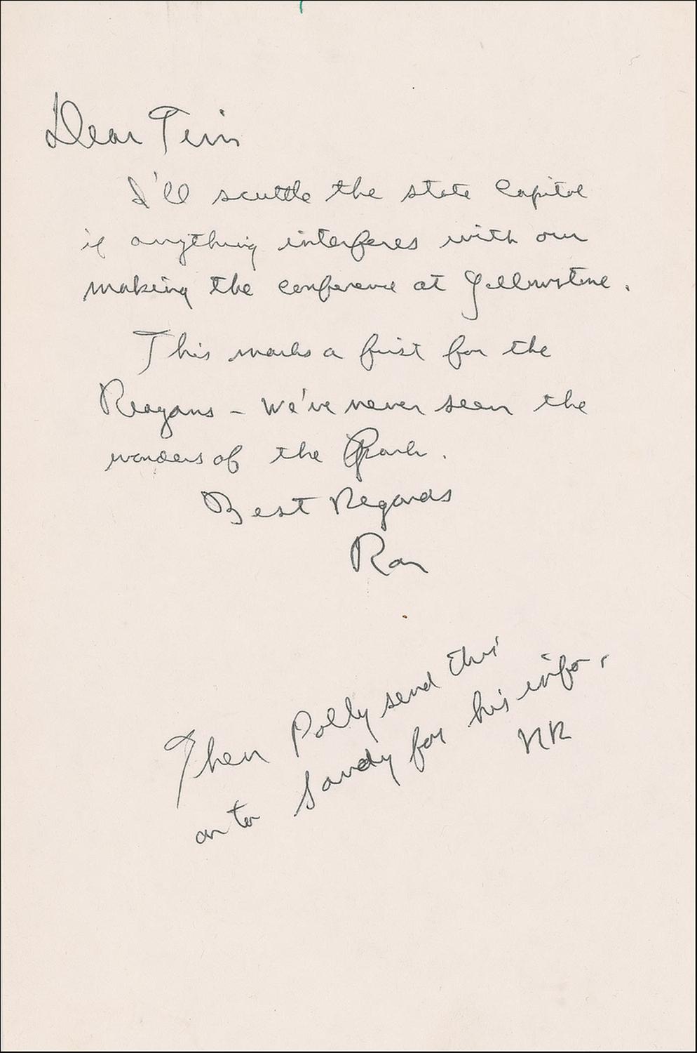 Brief draft ALS signed “Ron,” one page, 6 x 9, no date. Reagan writes “Tim” regarding a conference at Yellowstone National Park. In full: “I’ll scuttle the state capitol if anything interferes with our making the conference at Yellowstone. This makes a first for the Reagans—we’ve never seen the wonders of the Park.” Reagan has added the postscript: “Then Polly send this on to Sandy for his info. RR.” In fine condition.