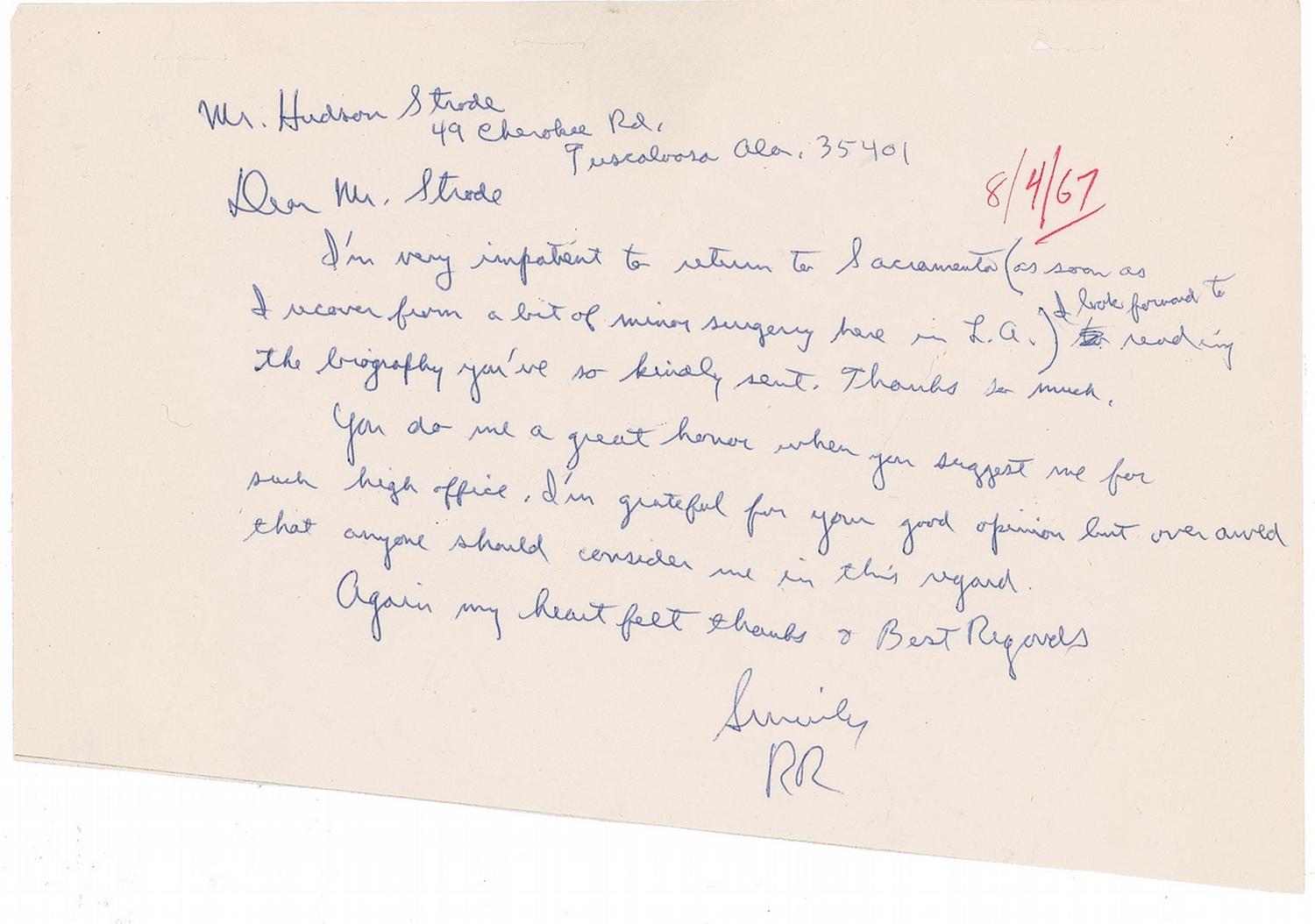 Draft ALS signed “RR,” one page, 8.5 x 6, dated in another hand August 4, 1967. Letter to Hudson Strode in Alabama. In full: “I’m very impatient to return to Sacramento (as soon as I recover from a bit of minor surgery here in L.A.) I look forward to reading the biography you’ve so kindly sent. Thanks so much. You do me a great honor when you suggest me for such high office. I’m grateful for your good opinion but over awed that anyone should consider me in this regard. Again my heart felt thanks & Best Regards.” In fine condition, with staple holes along top edge, some light wrinkling, and an irregular diagonally-trimmed bottom edge.