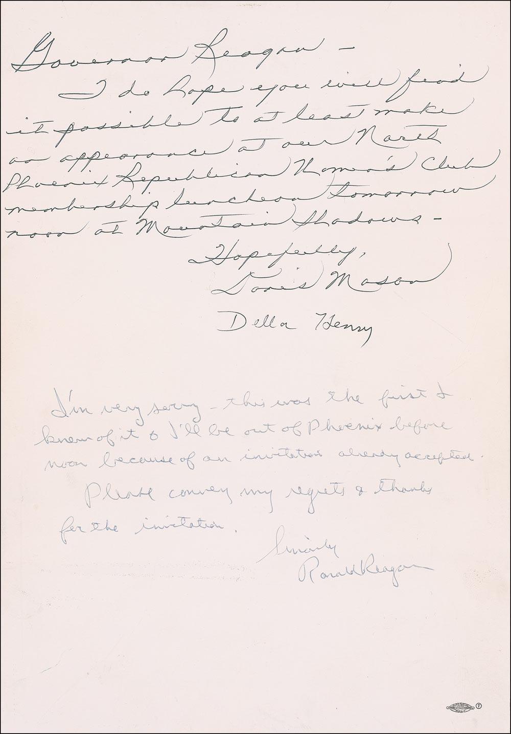 ANS, on the back cover of a program, 7 x 10, no date. Note written on the blank back cover of a program from the April 9, 1968, Trunk N’ Tusk Club meeting honoring Reagan. An invitation to speak is written above Reagan’s response. Reagan writes: “I’m very sorry – this was the first I knew of it & I’ll be out of Phoenix before noon because of an invitation already accepted. Please convey my regrets & thanks for the invitation.” In fine condition.