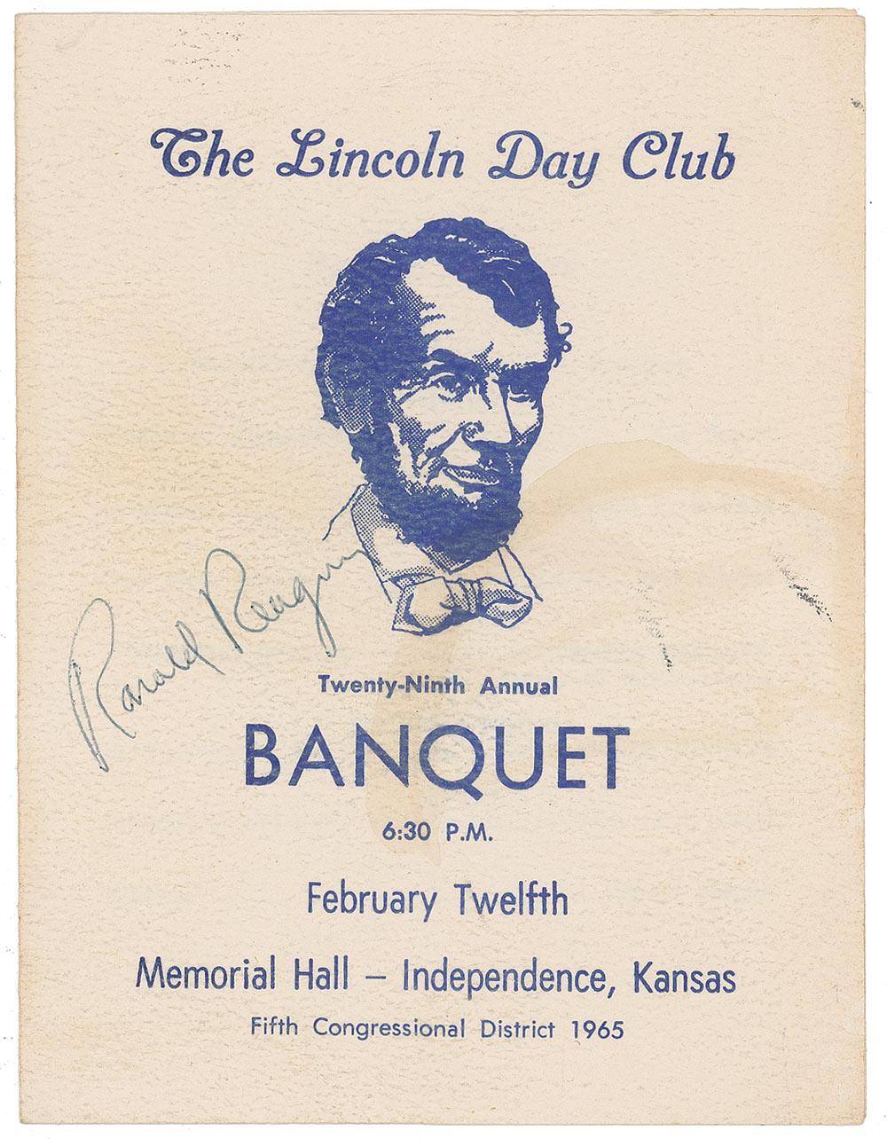 Program, 4.5 x 6, two pages for the 29th Annual Lincoln Day Club Banquet in Independence, Kansas, on February 12, 1965, signed on the cover in blue ballpoint. Scattered toning to covers, as well as a bit of scattered light soiling, otherwise fine condition.