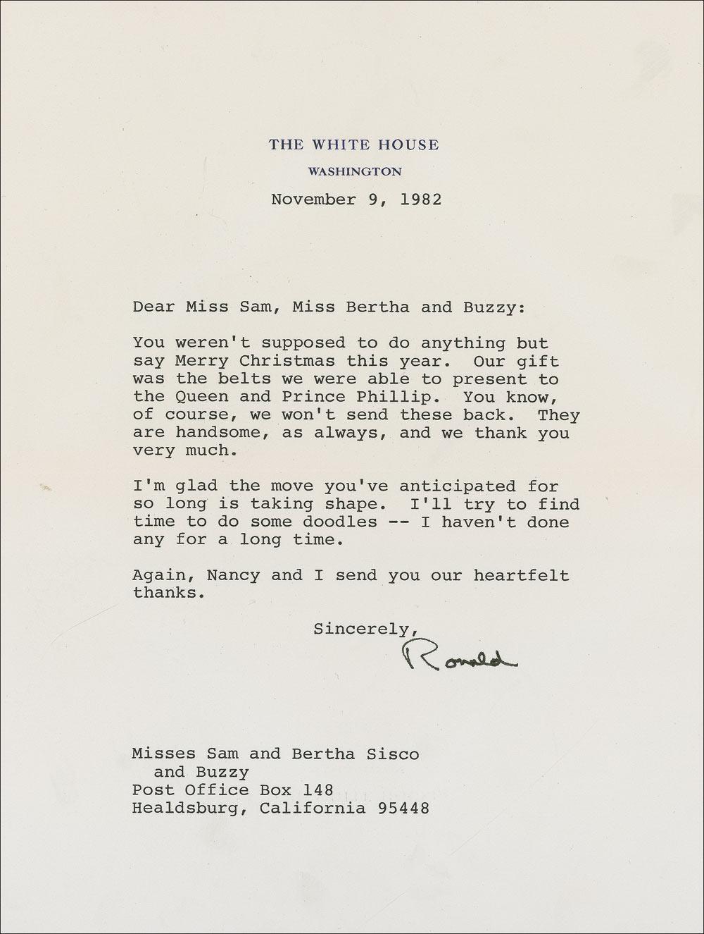 TLS as president, signed “Ronald,” one page, 6.75 x 8.75, White House letterhead, November 9, 1982. Reagan writes to the Sisco family in Healdsburg, California. In part: “You weren’t supposed to do anything but say Merry Christmas this year. Our gift was the belts we were able to present to the Queen and Prince Phillip…. I’ll try to find time to do some doodles—I haven’t done any for a long time. Again, Nancy and I send you our heartfelt thanks.” In fine condition. Accompanied by the original mailing envelope.