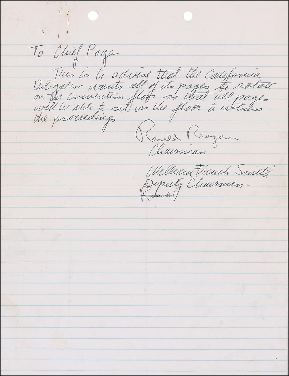 LS signed “Ronald Reagan,” one page, lightly-lined, 8.5 x 11, no date. Reagan, as chairman of the California Republican Delegation, requests, in full: “To Chief Page, This is to advise that the California Delegation wants all of its pages to rotate on the convention floor so that all pages will be able to sit on the floor to witness the proceedings.” Reagan had originally started his signature beneath that of the deputy chairman William French Smith (who would later serve as Reagan’s attorney general), signing “Ronal” before crossing it out and signing several lines higher, above the title of chairman. In very good condition, with intersecting folds with two vertical folds passing through the signature, wrinkling, two filing punch holes at the top of the page, and a rusty paperclip impression at the top.