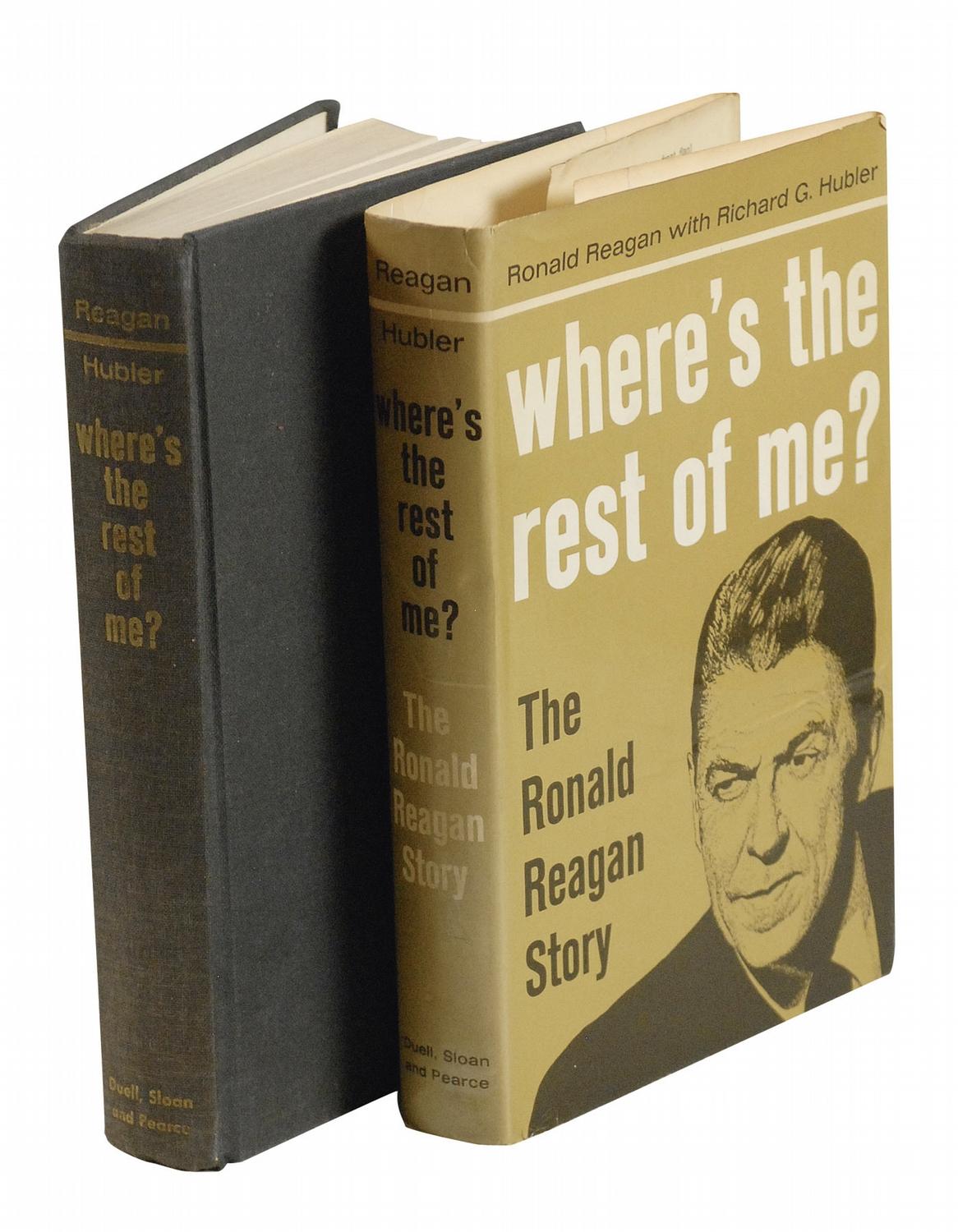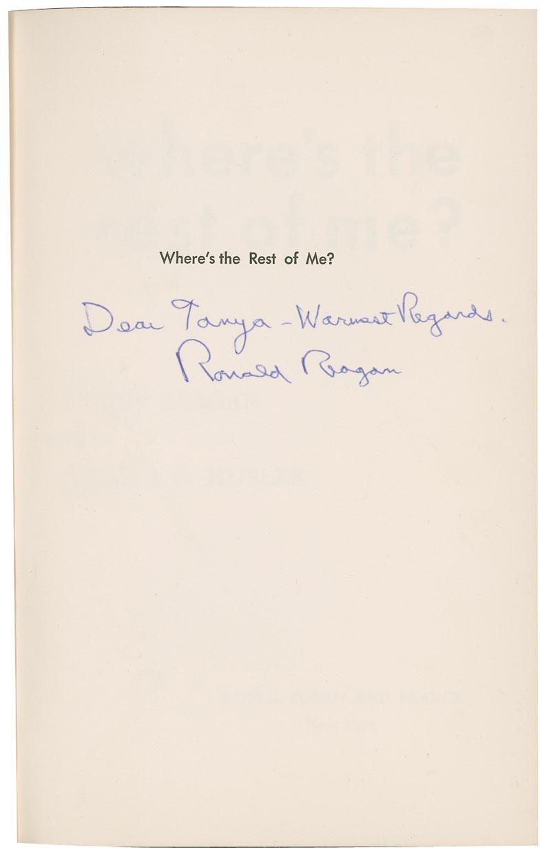 Signed book: Where’s the Rest of Me? Later printing. NY: Duell, Sloan and Pearce, 1965. Hardcover with dustjacket, 6.75 x 8.25, 316 pages. Signed and inscribed in blue ballpoint on the half title page: “Dear Tanya—Warmest Regards, Ronald Reagan.” Light soiling to the end pages and boards, sunning to the spine, and scattered wear to the dust jacket with a moderate horizontal crease across the front cover through Reagan’s forehead, otherwise fine condition.