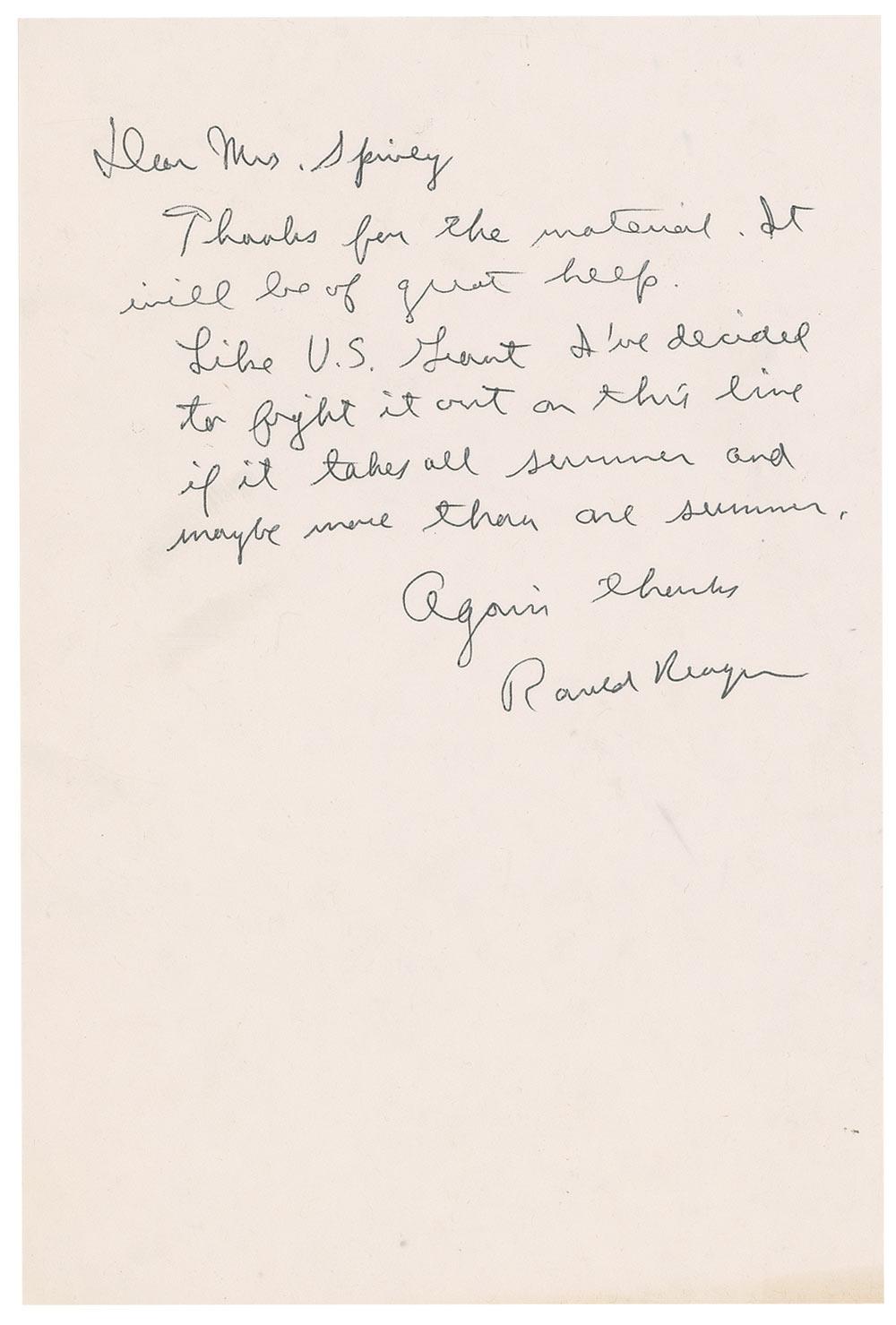 Likely written after taking office as California’s governor, this correspondence reflects some of the ideological fervor that fueled Reagan’s early political methods. His paraphrase of Grant’s dispatch to Washington, D.C., during the Battle of Spotsylvania Court House in 1864—’I propose to fight it out on this line, if it takes all summer’—turned out rather prophetic. Just as Grant’s campaign turned out to be a bloody and tactically inconclusive venture, Governor Reagan soon found that he, too, was unable to create a favorable environment for every battle. The pressures of politics quickly forced the new administration to compromise, turning his gubernatorial tenure into one considered symbolically radical but substantively conventional. However, the statement shows the determination that would also one day take Reagan to the White House.